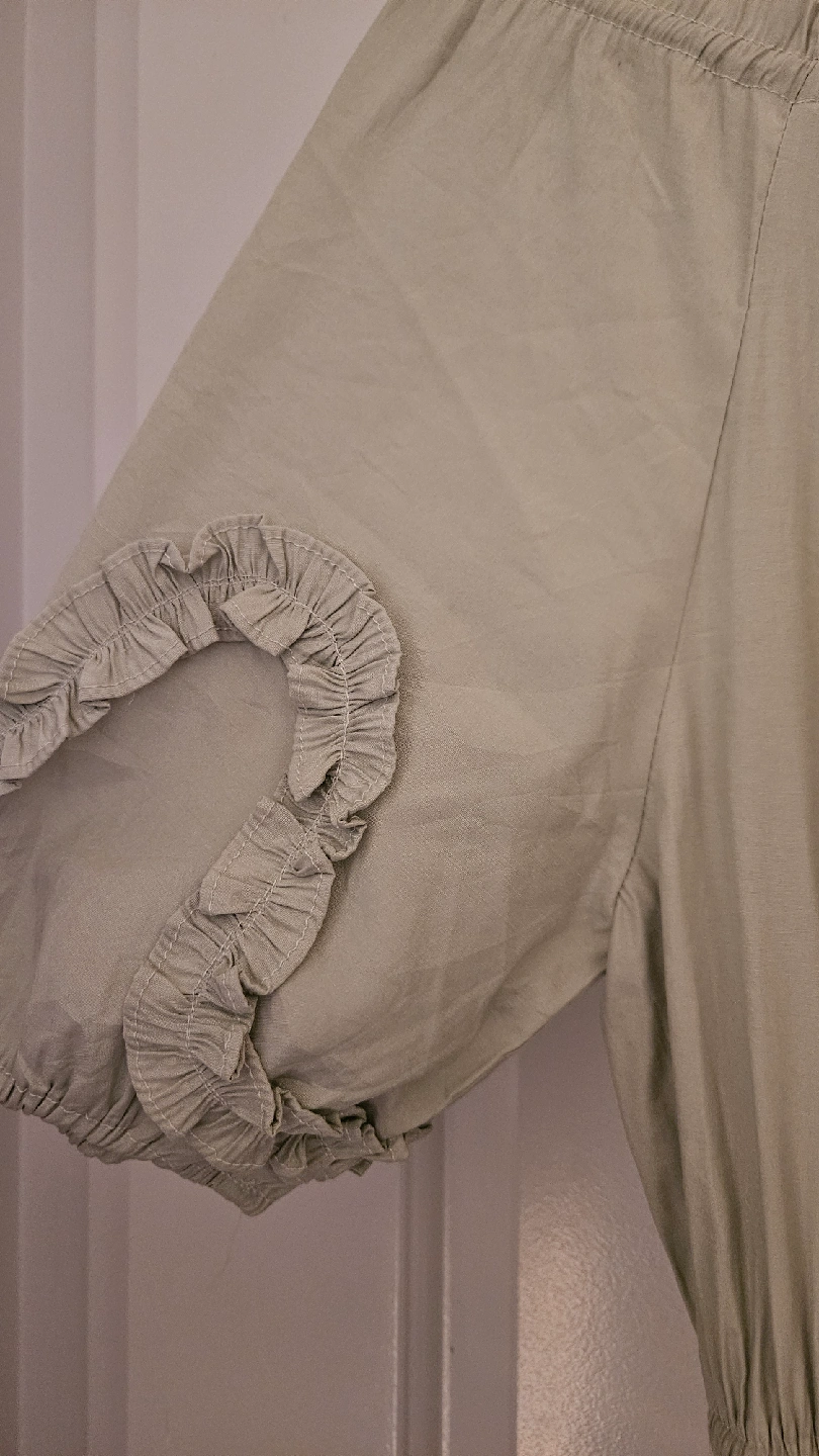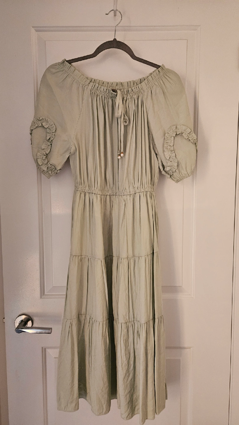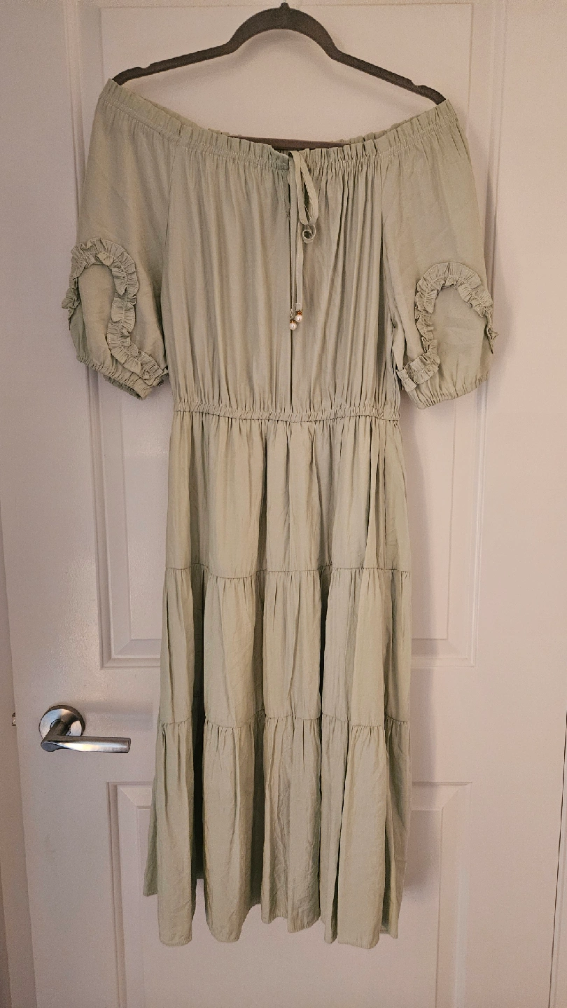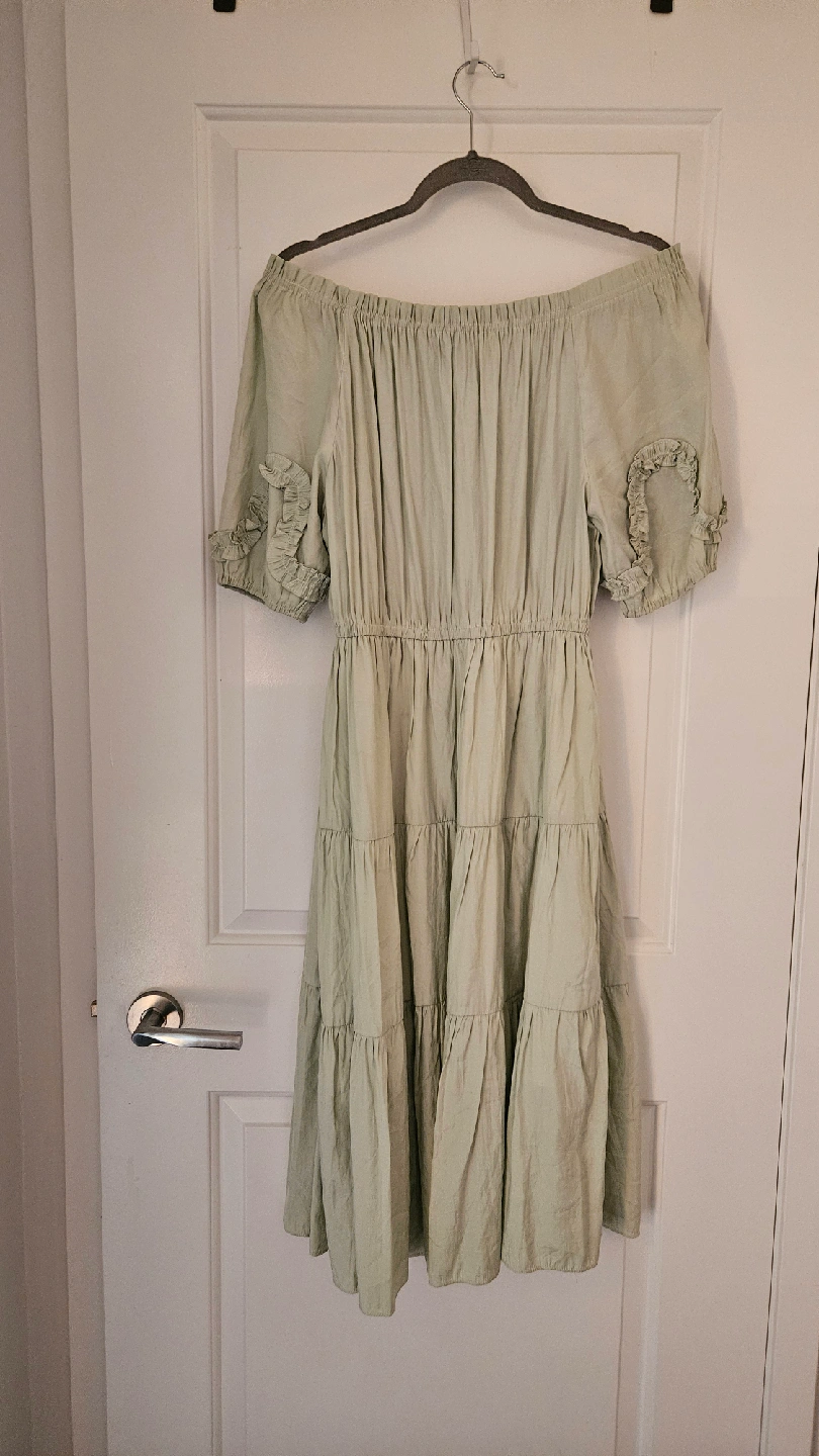Cute sage green off-the-shoulder dress with a tiered design! It's brand new, never been used. Size Medium. Perfect for a casual day out or a fall or summer event.