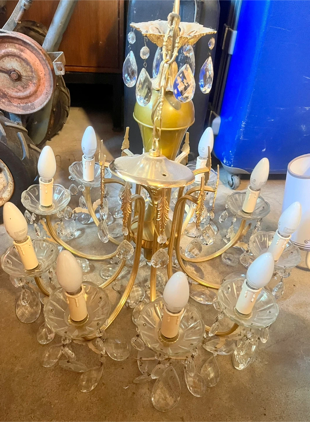 Selling a beautiful gold-coloured chandelier! It features clear crystal drops that add a touch of elegance to any room. Perfect for adding some sparkle to your dining area or living room.