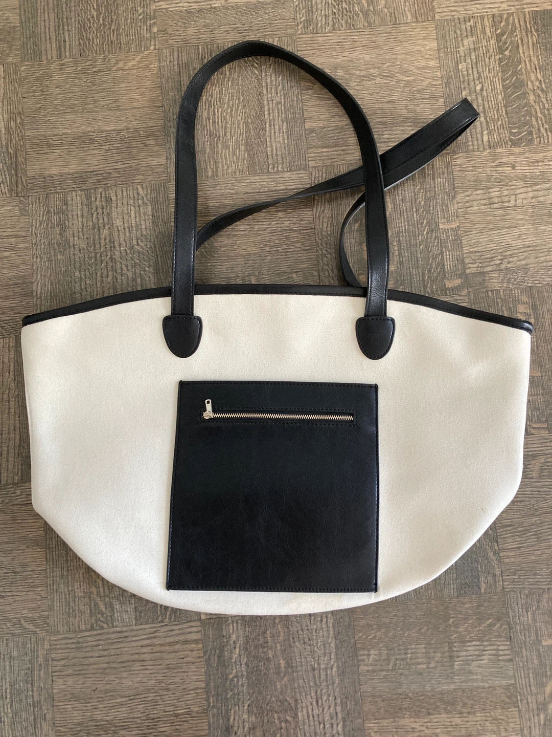 Selling a Roots tote bag in beige and black! It's in great condition and has a zipper pocket on the outside and a small pocket on the inside