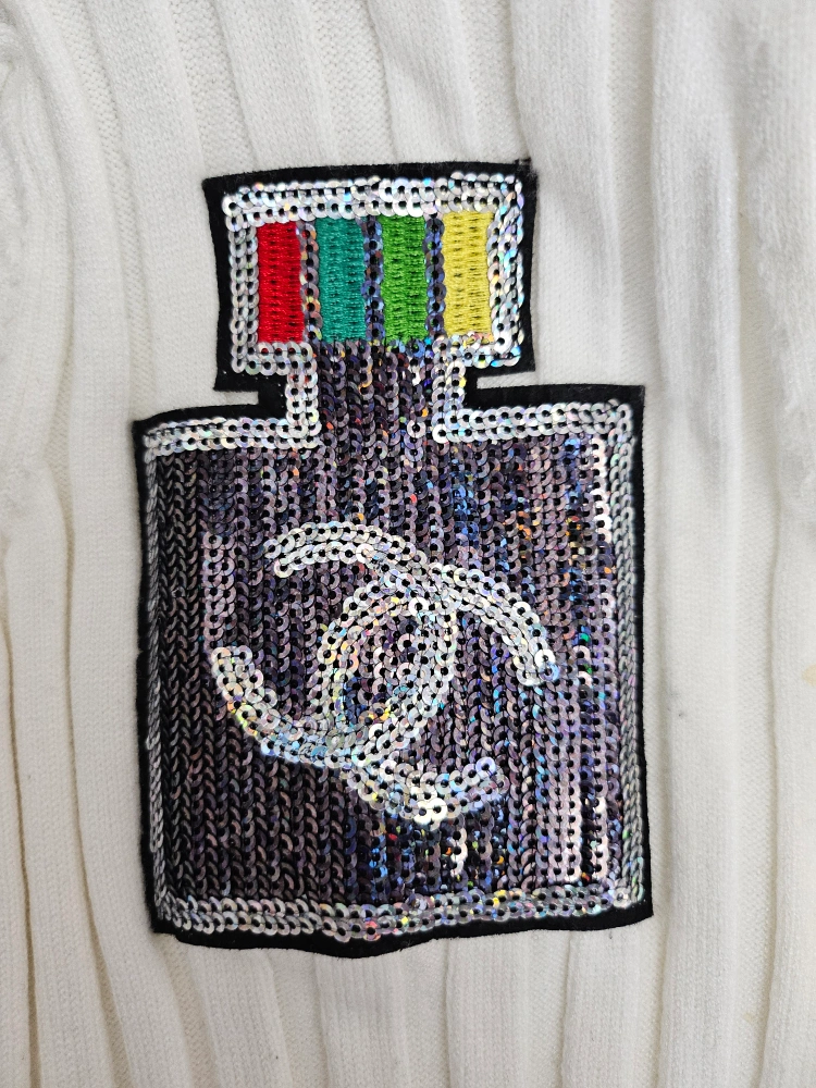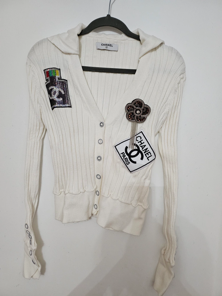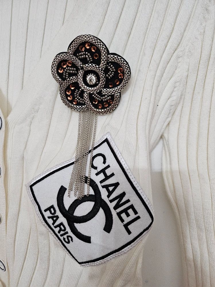 🖤🤍A stylish Chanel knit cardigan featuring unique embellishments. It has a ribbed texture and eye-catching designs, perfect for adding a touch of luxury to your wardrobe🤍🖤