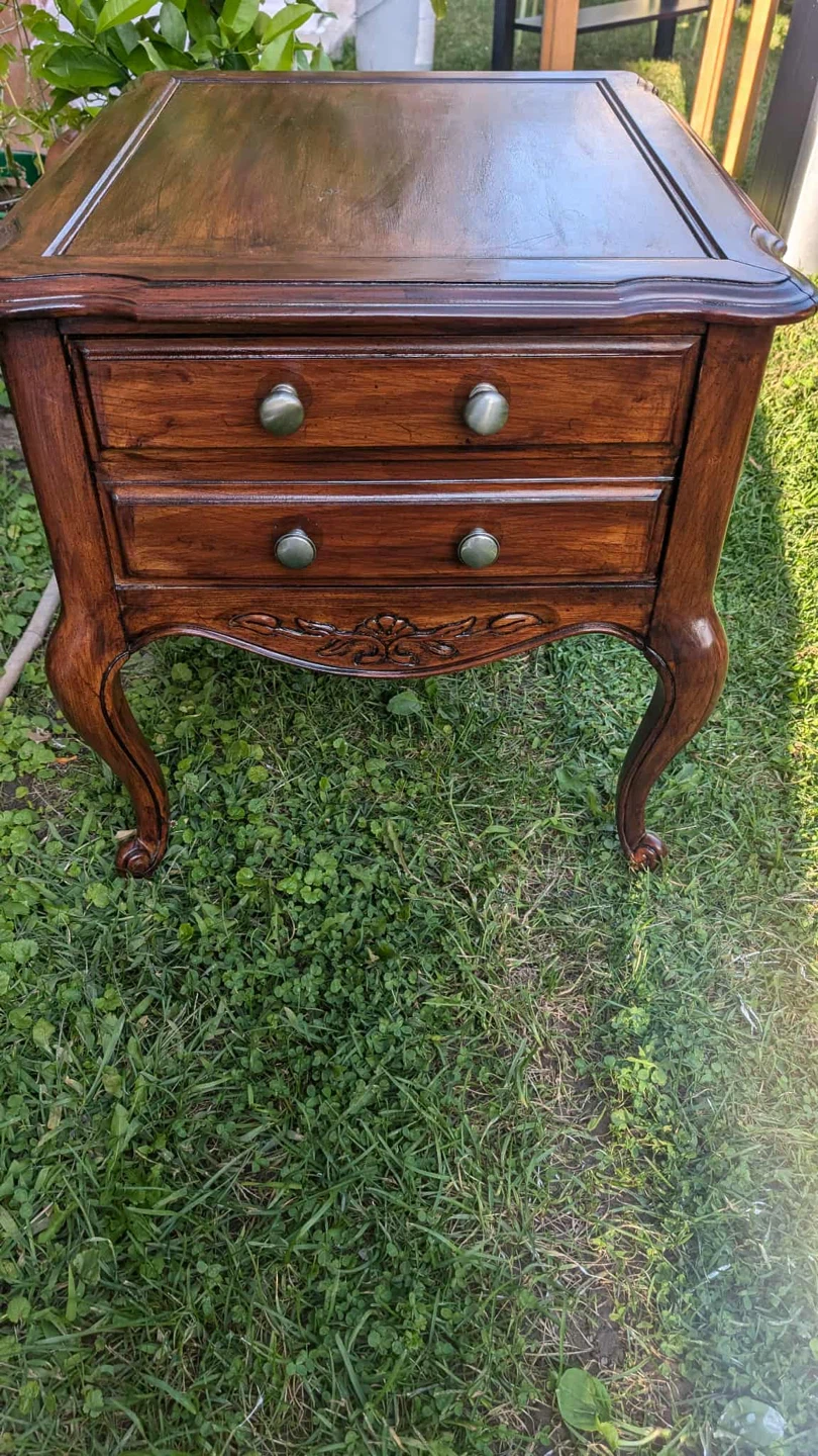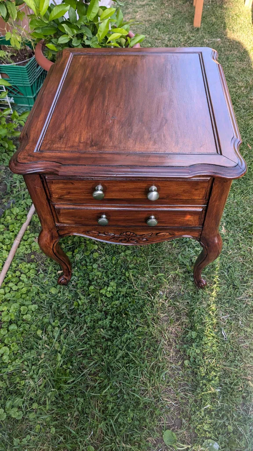Selling a vintage wooden end table. It's a lovely piece with a rich, dark wood finish and two drawers. The legs have a classic, curved design, and there's decorative carving just above the drawers. It would make a great addition to any living room or bedroom!