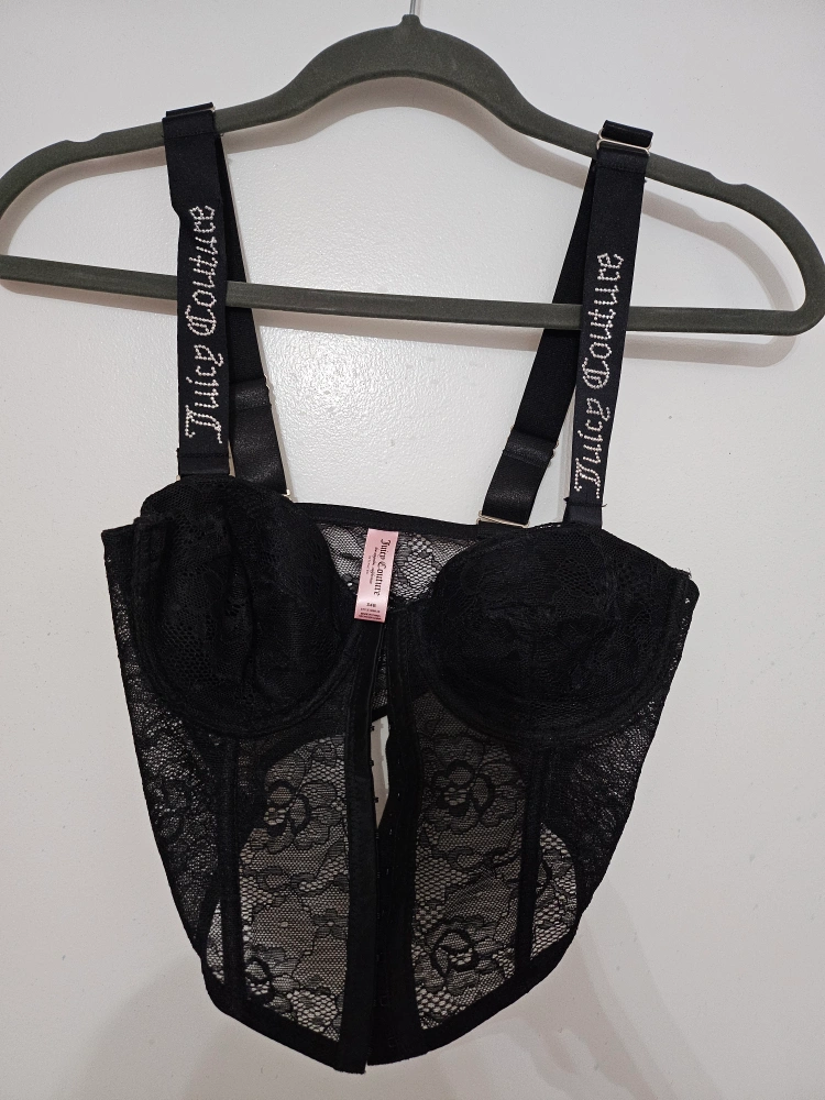 🖤Selling a Juicy Couture bustier bra in black lace! It's a size 34B and has the Juicy Couture logo on the straps. Perfect for adding a touch of glam to your wardrobe!🖤