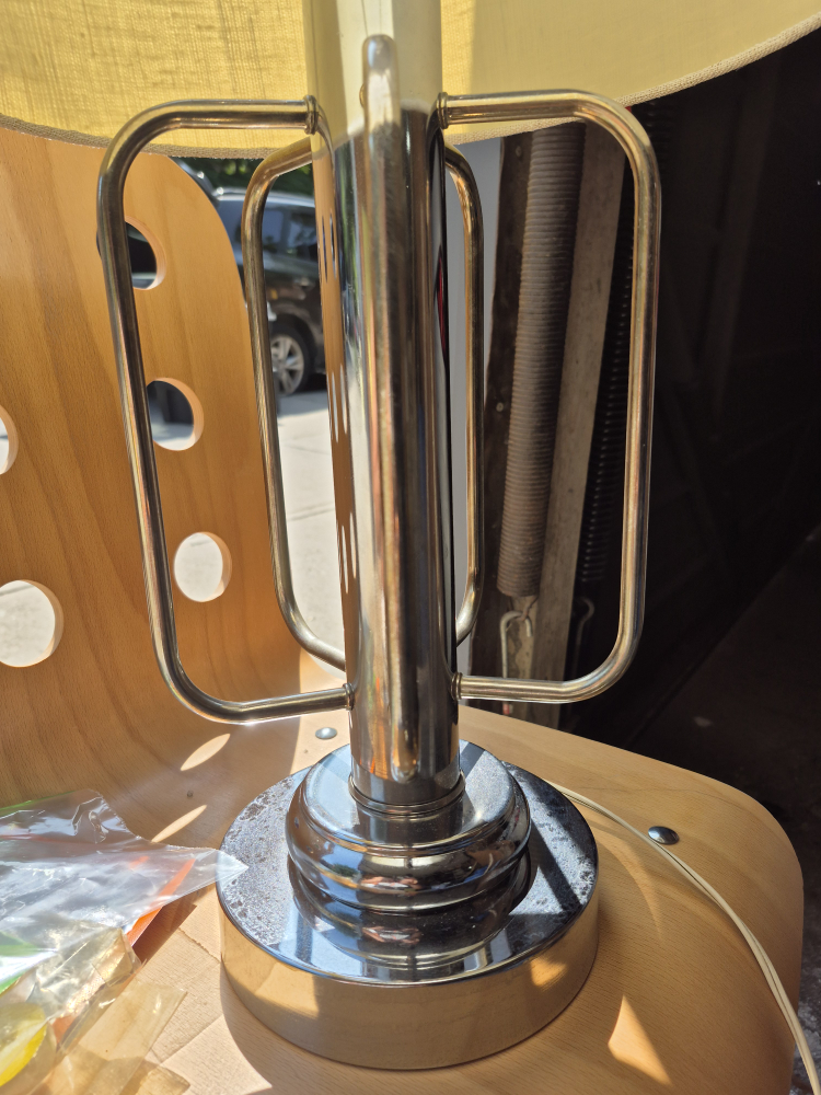 Selling a stylish chrome table lamp! The shade is a neutral beige colour. The lamp stands 26 inches tall, with a 7-inch wide base and a 14-inch wide shade. It would look great in any room!