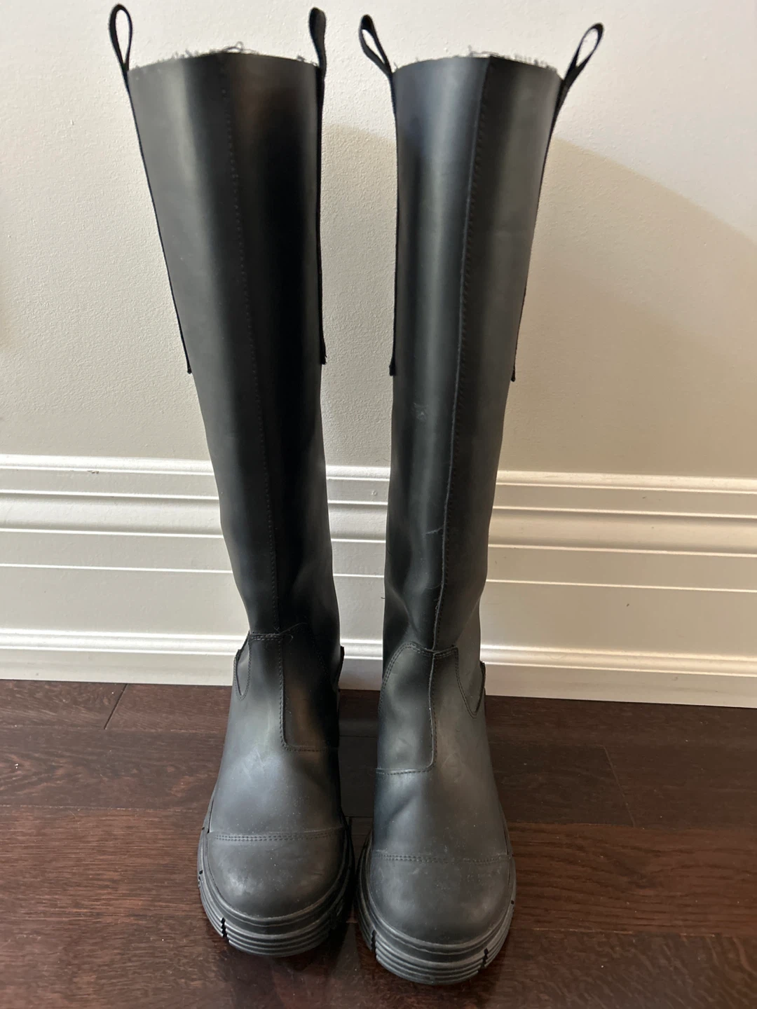 Selling a pair of Ganni knee-high rubber boots They are a size 36. Please note there is some minor rubber missing to the heel as pictured. Retail for $475. Like new. Only worn a few times.