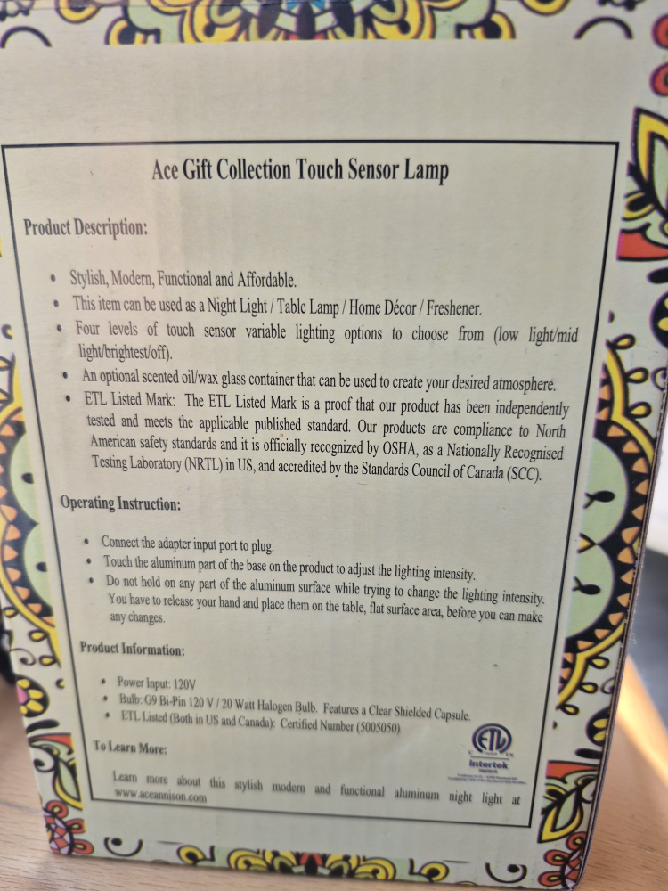 Selling an Ace Gift Collection Touch Sensor Lamp. It's stylish, modern, functional, and affordable. This item can be used as a night light, table lamp, home décor, or freshener. It features four levels of touch sensor variable lighting options to choose from (low light/mid light/brightest/off). An optional scented oil/wax glass container can be used to create your desired atmosphere. The box has some safety instructions and product information as well