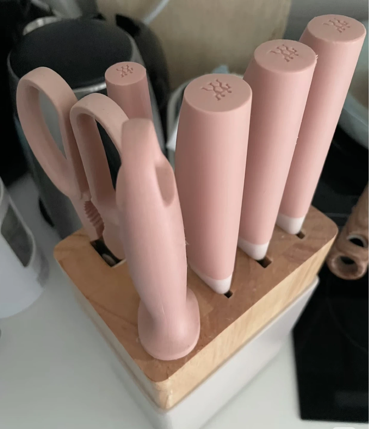 Selling a cute pink knife block set from Zwilling J.A. Henckels! This set includes several knives and a pair of kitchen shears, all neatly organized in a wooden block. Perfect for adding a touch of colour to your kitchen while keeping your knives sharp and accessible
