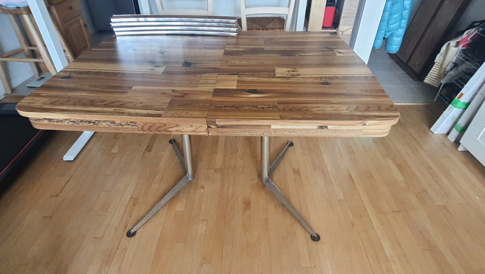 Selling a lovely wooden dining table. The table is 47.5 inches wide and 35.5 inches deep. The height is 30 inches.