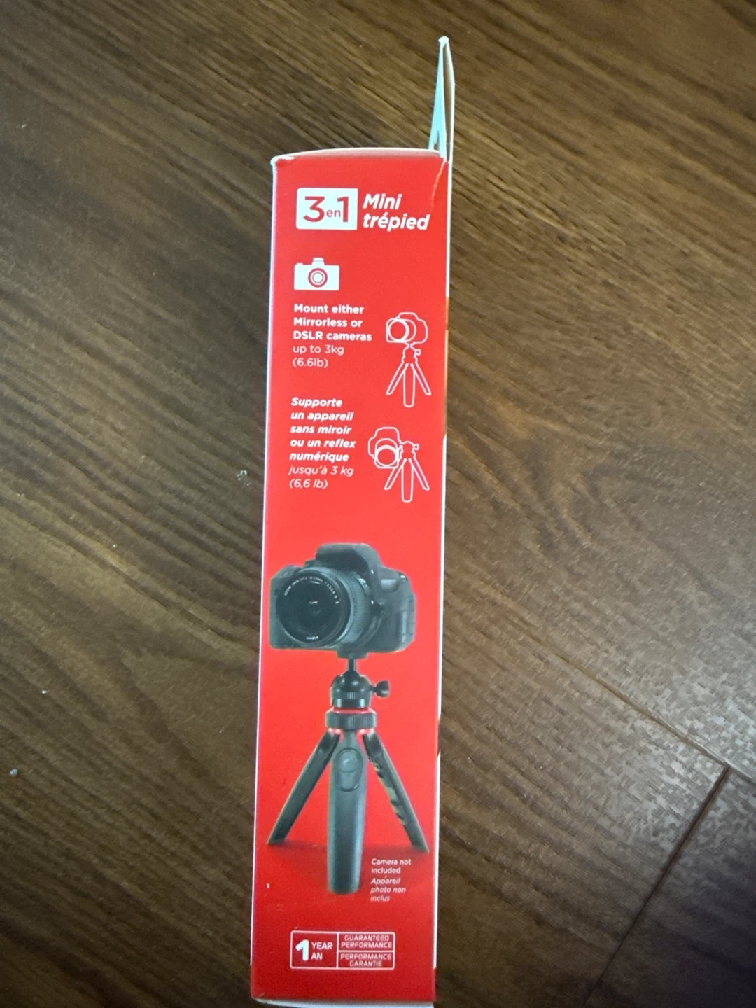 Selling a brand new Mobifoto Mobipod TT25 3-in-1 mini tripod! It's perfect for cameras and smartphones. - Expands to fit any smartphone - Universal camera mount, ¼"-20 - All-in-one design with all its accessories hidden in the legs - Compact for travel (3.25"/po x 2.4"/po x 1.8"/po) Mount either mirrorless or action cameras up to 3kg (6.6lb) Comes with the original box ***Missing remote shutter included, works up to 20ft (6m) with Android 4.3 and up, iOS 5.0 and superior