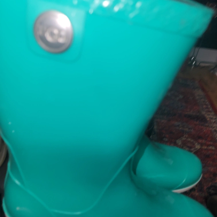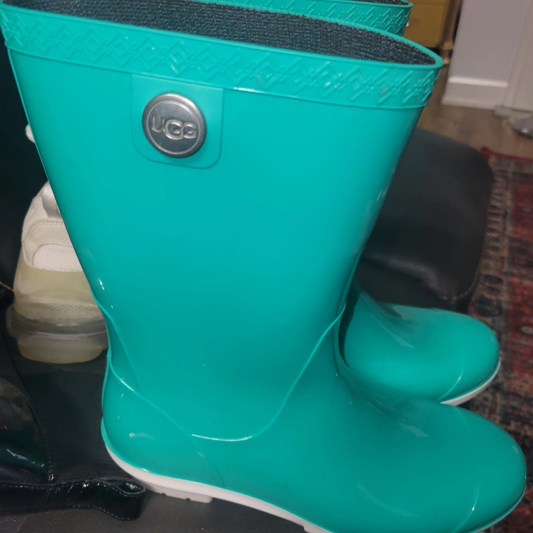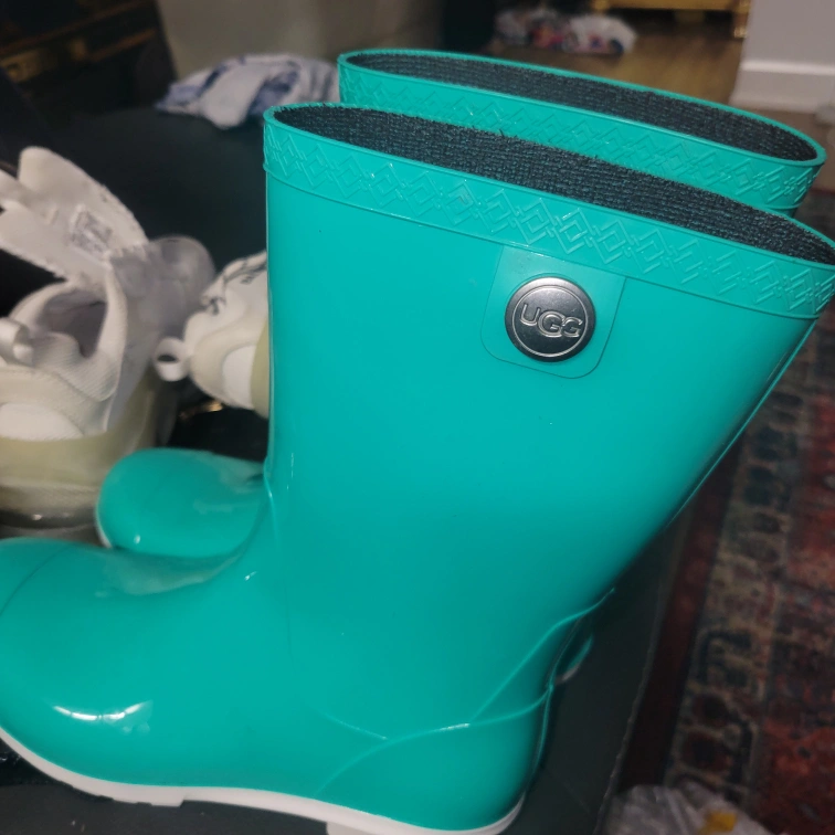 Here are some UGG kids rain boots in a vibrant turquoise colour! They're in great shape and ready for some puddle jumping. Size is 1 Little Kid.