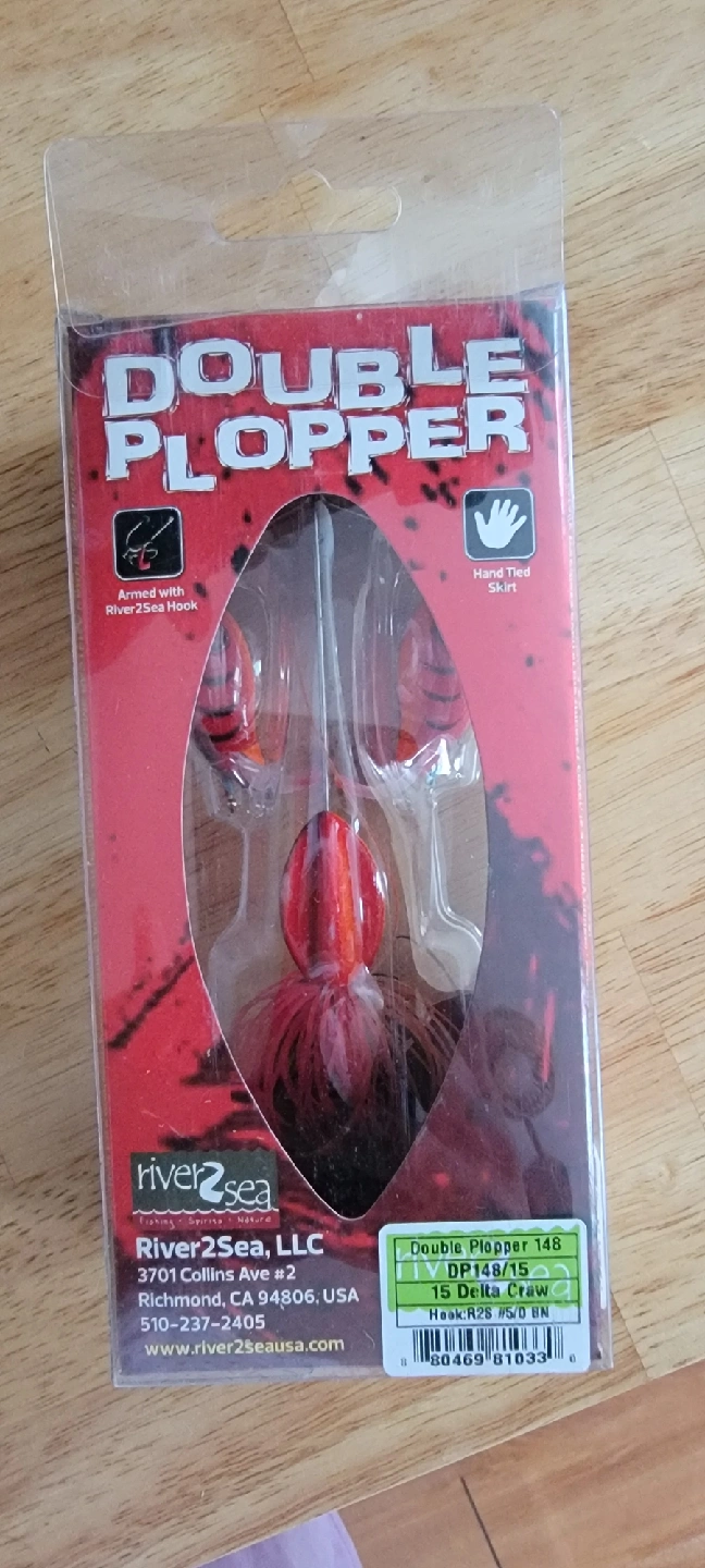 Selling a brand new River2Sea Double Plopper 148 fishing lure! It's still in its original packaging. This lure features a hand-tied skirt and is armed with River2Sea hooks. It weighs 5/8 oz and is 5 3/4 inches long. It's designed to create twice the magic plopper sound and is deadly hooker!