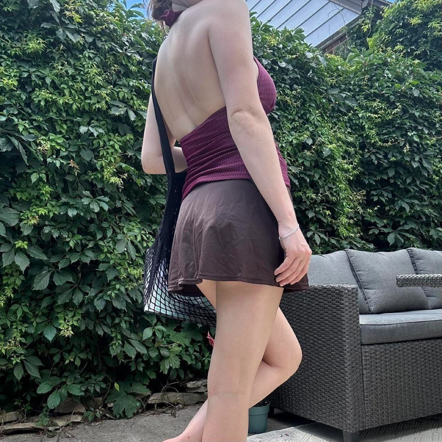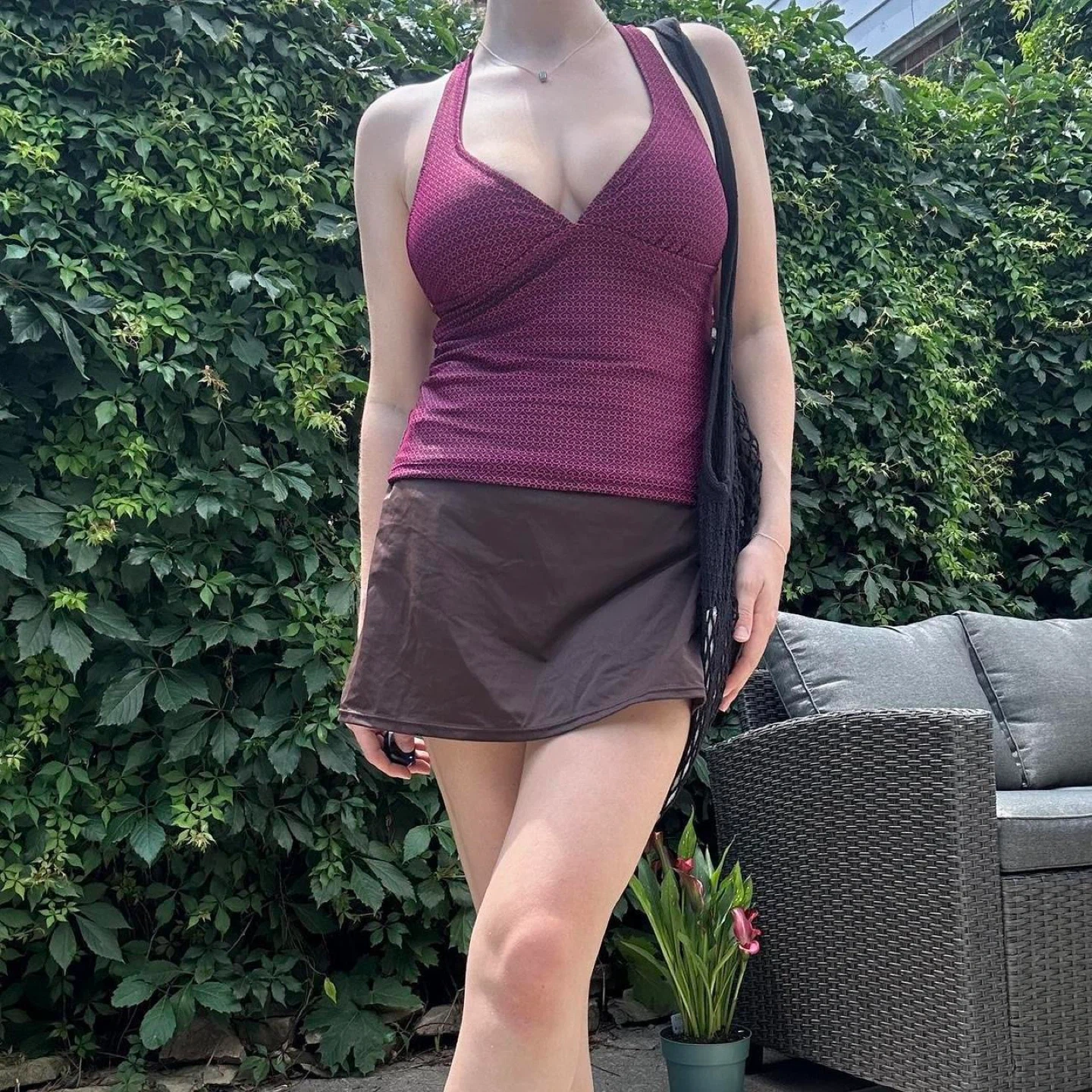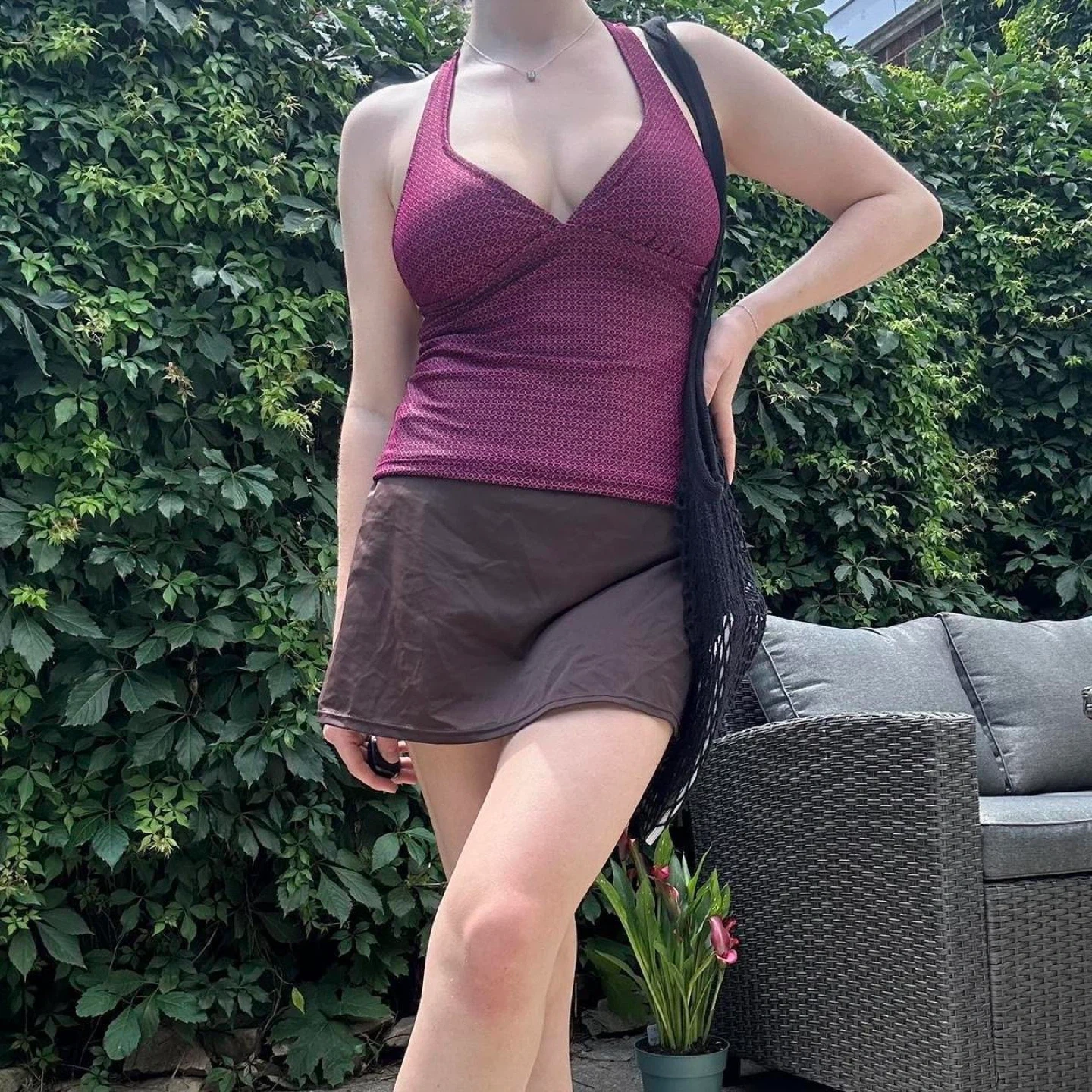 Heart pattern, halter top, tankini set, pink accents, brown swimwear, Y2K style, retro swimsuit, playful print, fitted silhouette, summer bikini