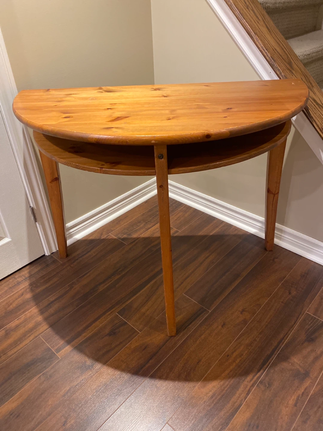 Selling a cute half-moon shaped console table. It's made of wood and would look great in an entryway or hallway. It has a shelf underneath for extra storage too!