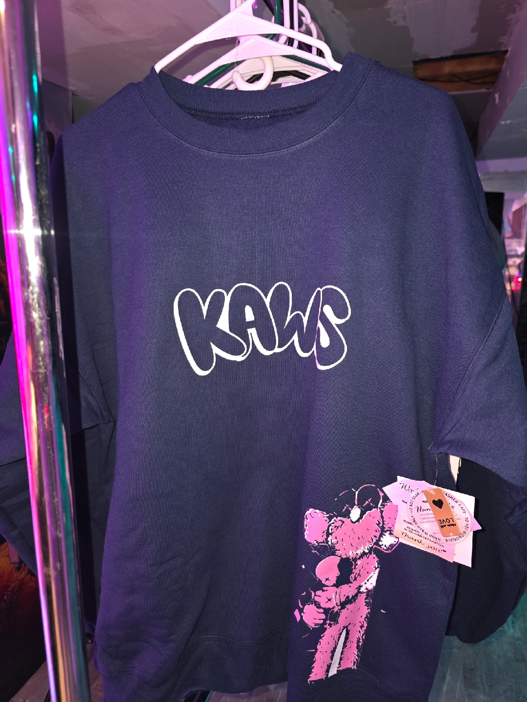 Selling a KAWS crewneck sweatshirt and a graphic tee! Both are in great condition and feature unique KAWS designs. The crewneck has a large KAWS logo on the front and a graphic on the sleeve. The tee has a cool KAWS character design on the front