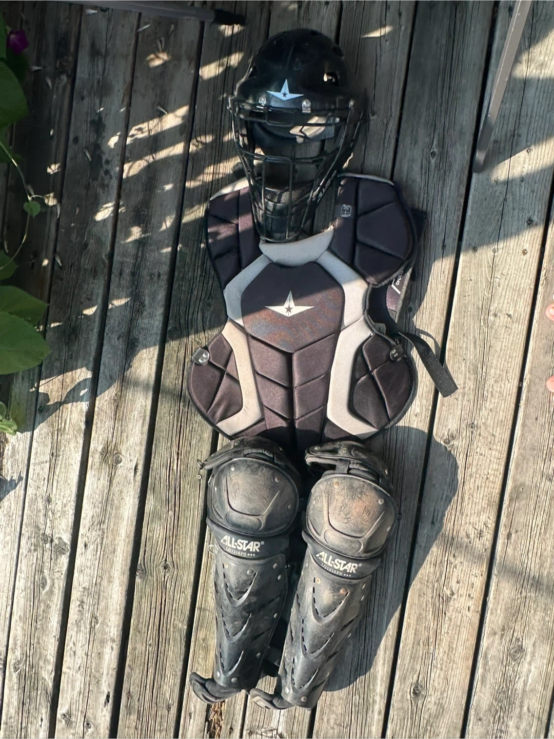 Selling a used All-Star catcher's gear set. Includes the helmet, chest protector, and leg guards. Shows signs of wear on knees but rest like new for baseball or softball. Wore only one season