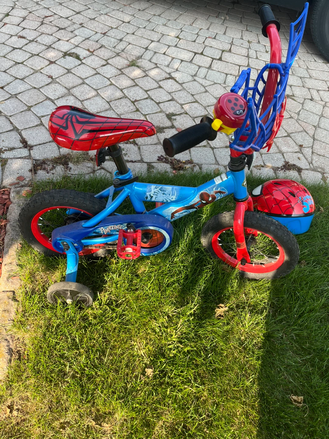 Selling a cute Spiderman-themed kids' bike! It comes with a matching Spiderman helmet for extra safety and fun. Perfect for little ones who love the friendly neighbourhood superhero. Training wheels attached