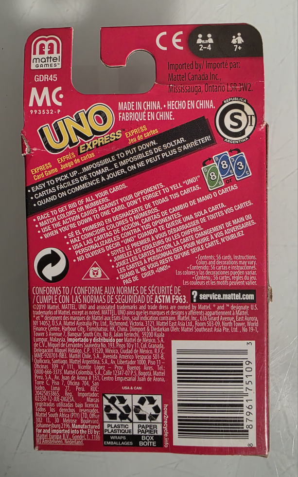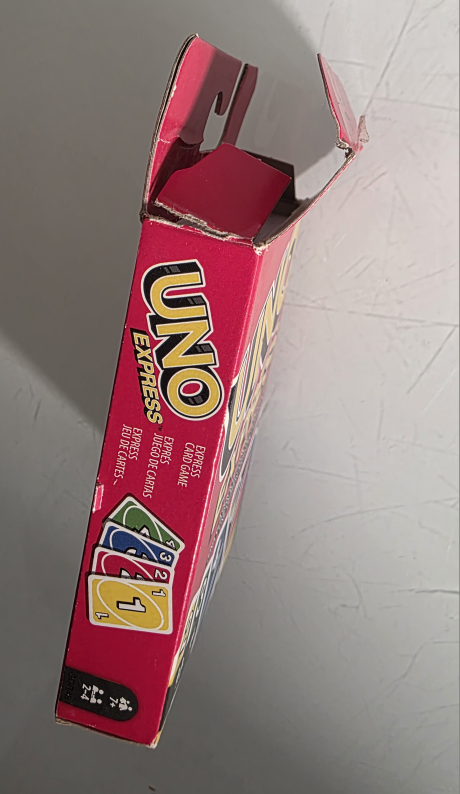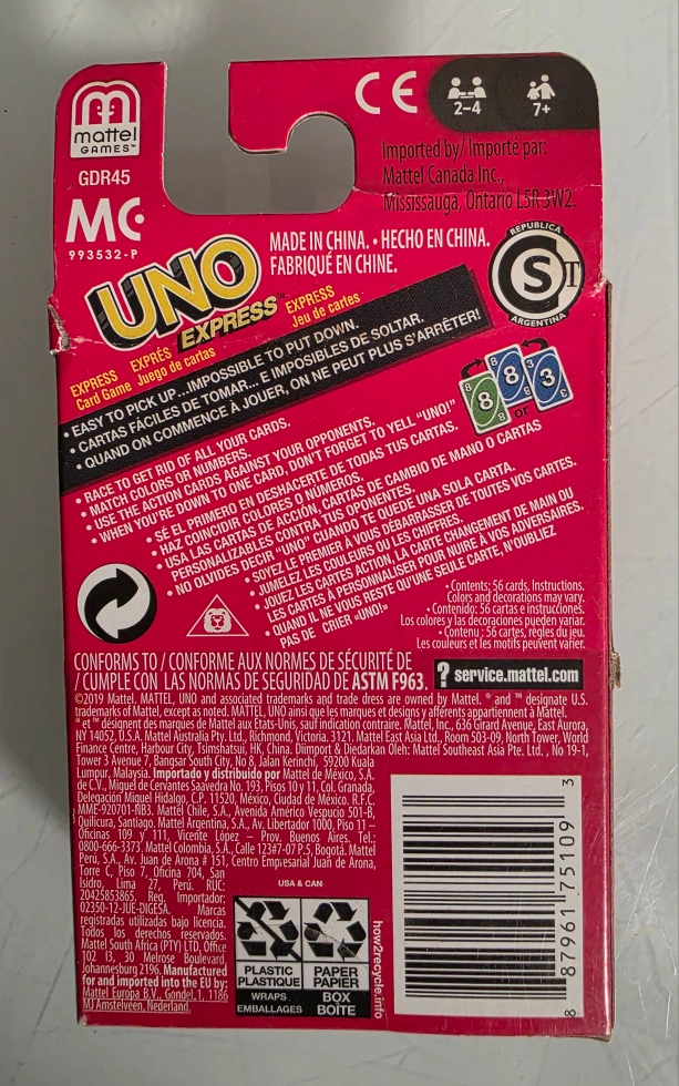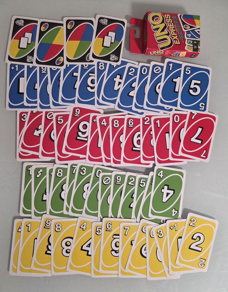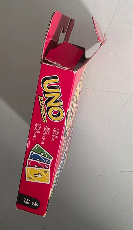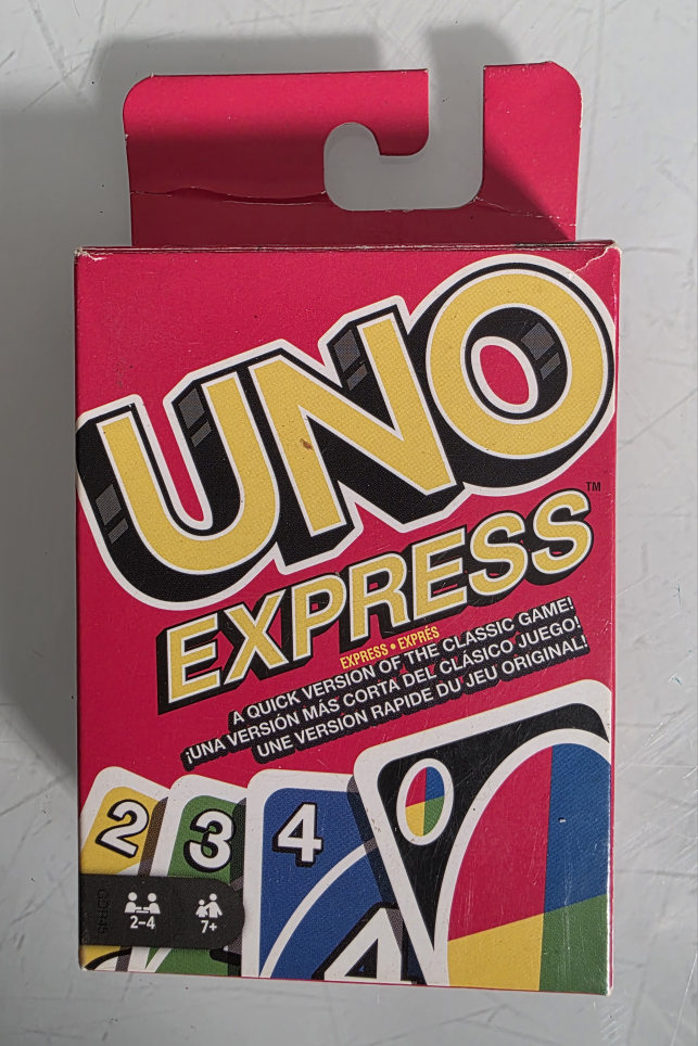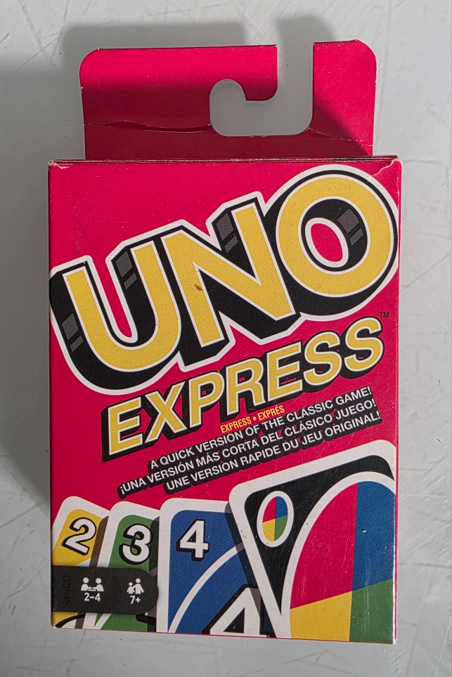 UNO Express is a quick version of the classic game. Includes all 56 cards. Recommended for 2-4 players and ages 7+. No instructions and one of the tabs on the inside of the pack has a tear.