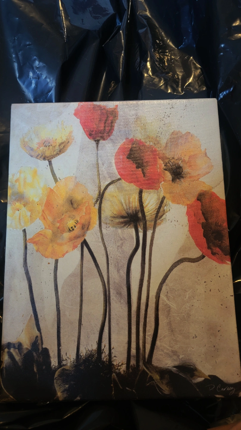 Here's a lovely canvas print featuring vibrant floral artwork. It's perfect for adding a touch of colour to any room! The canvas is in good condition on the front. Backside was ripped but doesnt effect the artwork.