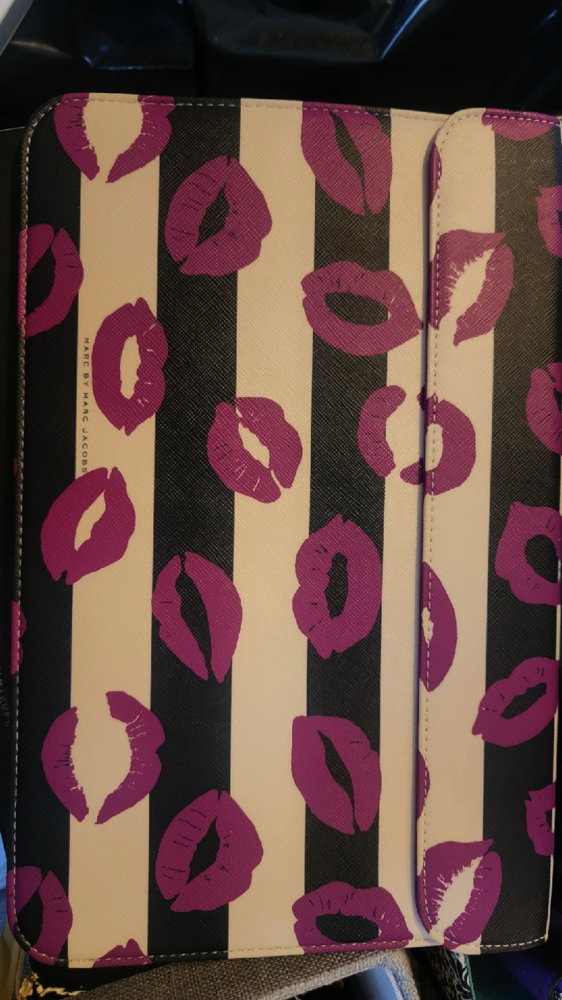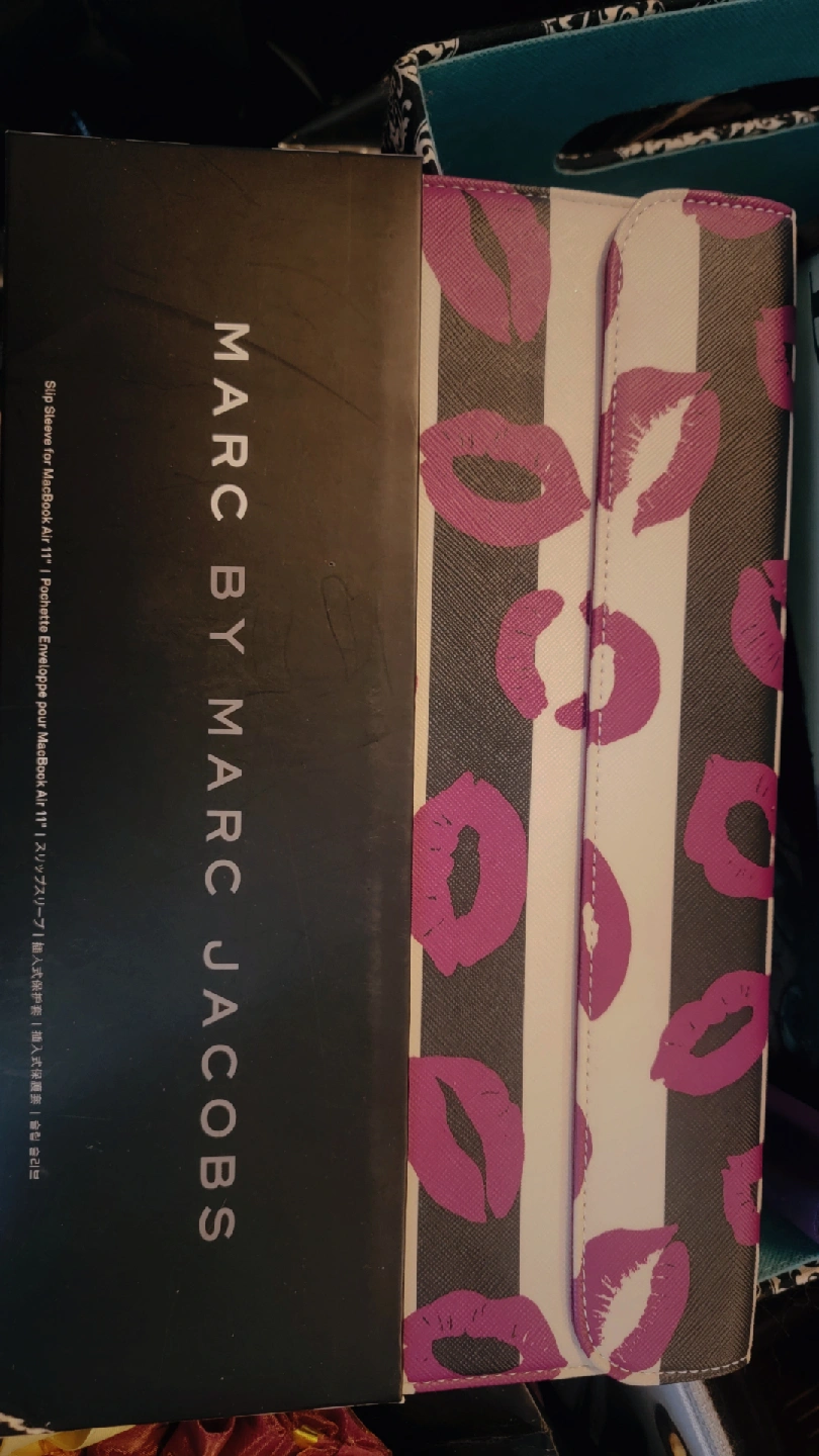 Selling a Marc by Marc Jacobs laptop sleeve for an 11" Macbook air! It features a fun purple lip print on a striped background. The sleeve is in great (unused brand new condition) & comes with its original box