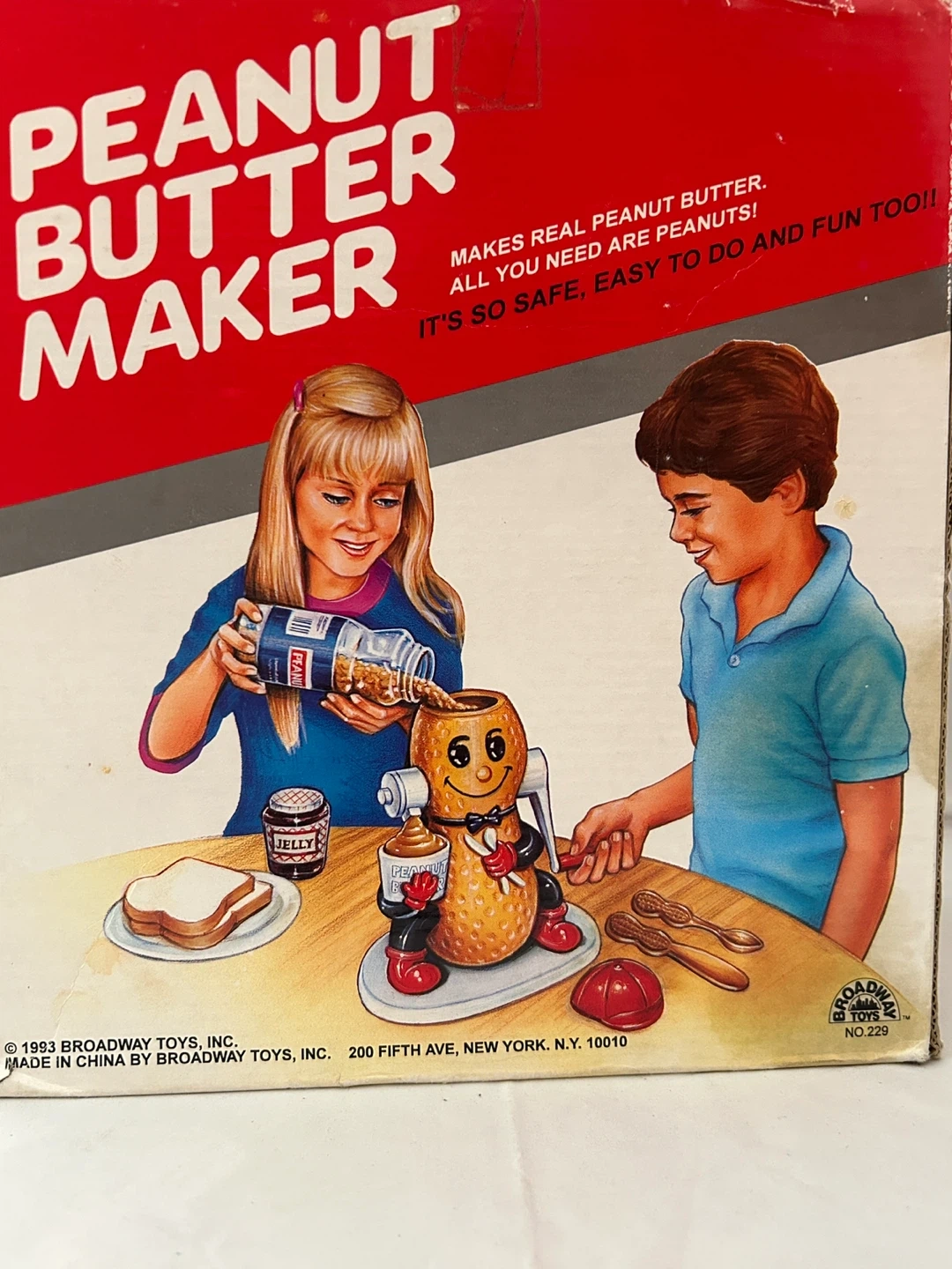 Hand cranked Peanut Butter Maker by Broadway Toys! It's for ages 5 and up. The set includes the peanut butter making machine, a peanut-shaped spoon, a peanut-shaped all-purpose spreader. It's a fun and safe way to make real peanut butter! Comes in its original box. Includes easy to follow instructions and recipes (sandwich, milkshakes, cookies, fudge, ice cream, candy). All you need are peanuts. Safe and fun.