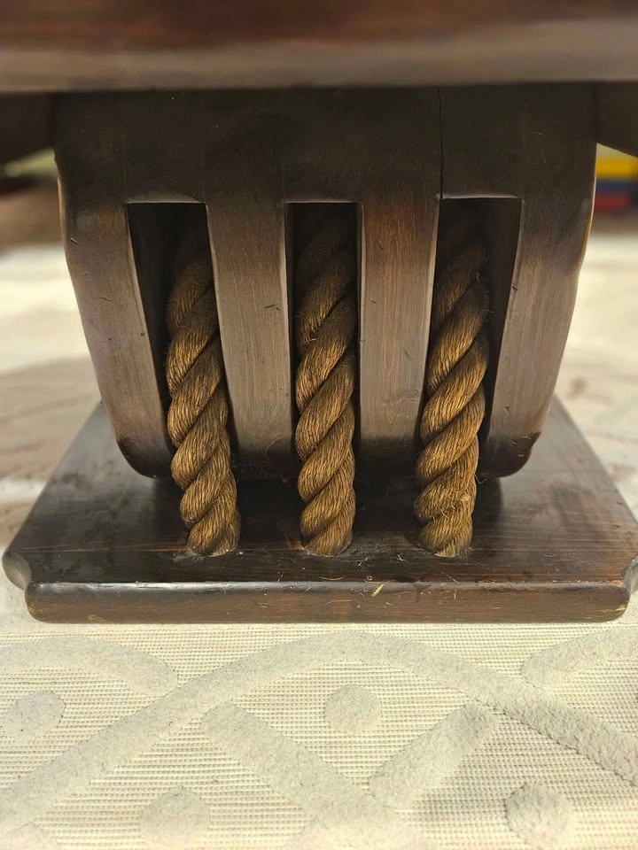 Bring a touch of nautical elegance and artistic flair to your living space with this stunning whale-form solid pine coffee table. Inspired by the graceful curves of the ocean's majestic creatures, this unique table is a true conversation piece, combining sculptural beauty with practical functionality. The intricate design evokes a sense of movement and fluidity, making it a striking focal point in any room. The rope & pulley base further adds to its charm. Minor age appropriate wear.