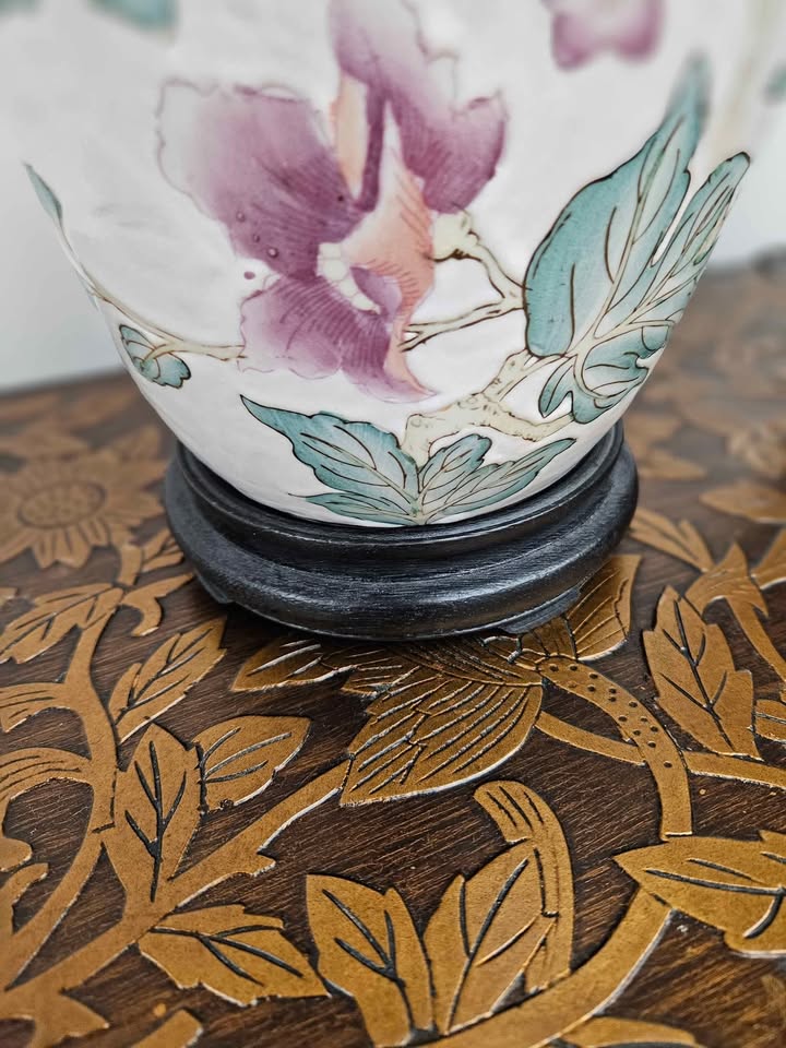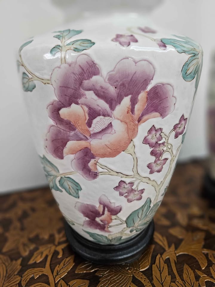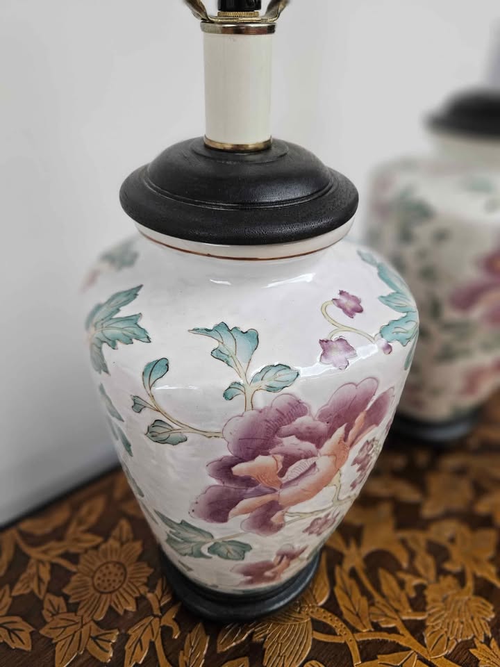 Lovely pair of porcelain table lamps with pink and purple floral pattern. Does not include a shade. Price is for the set.