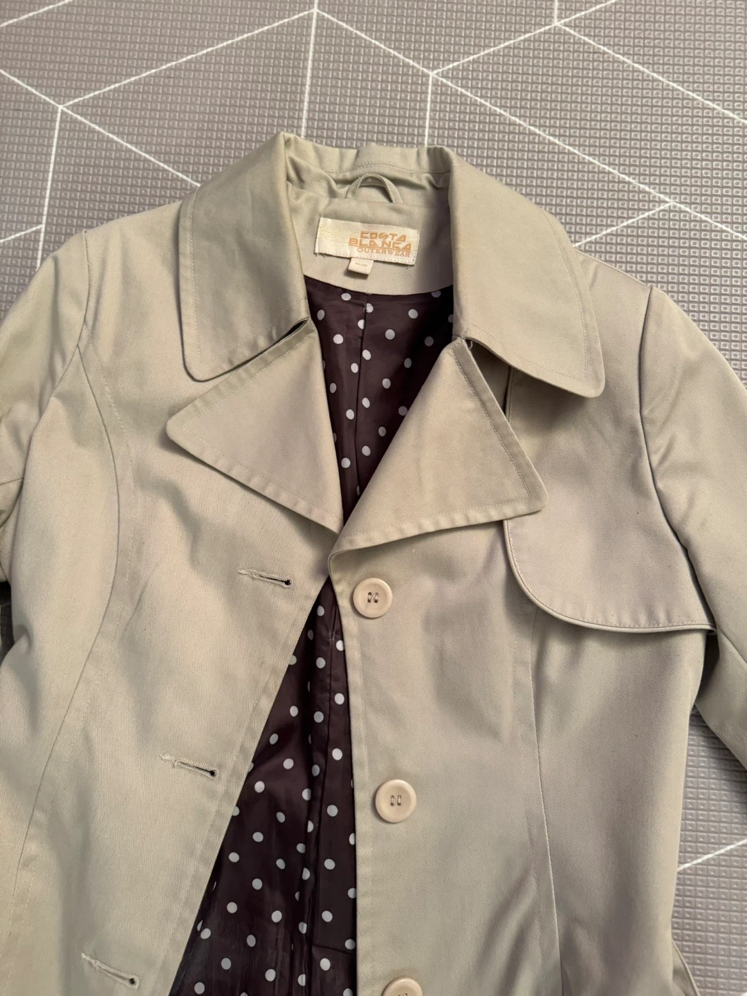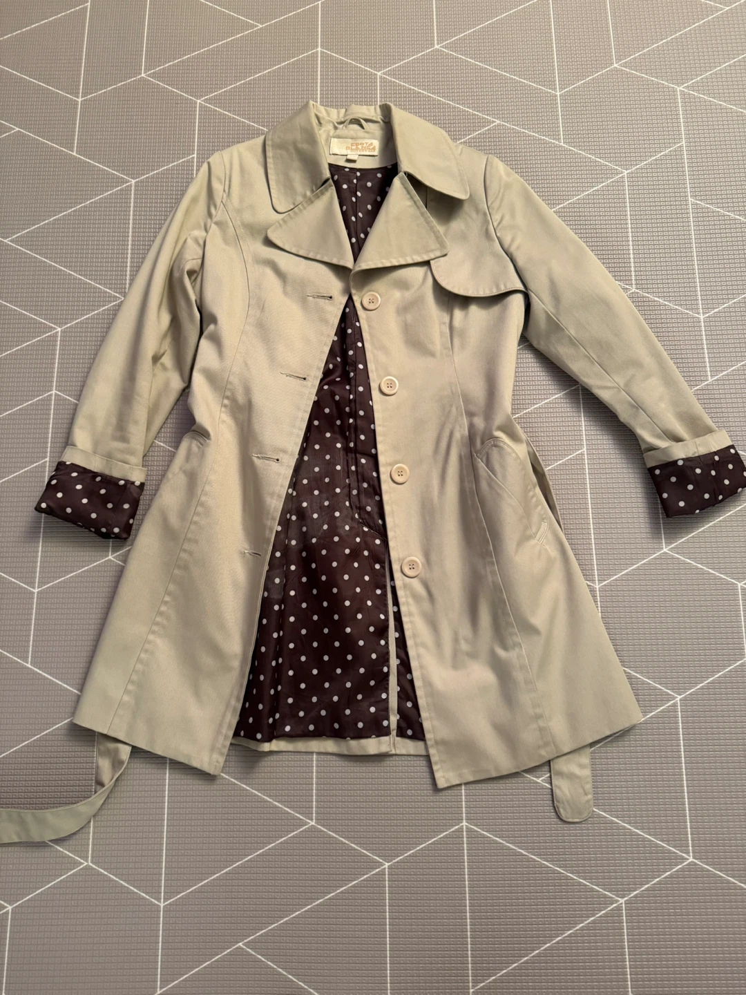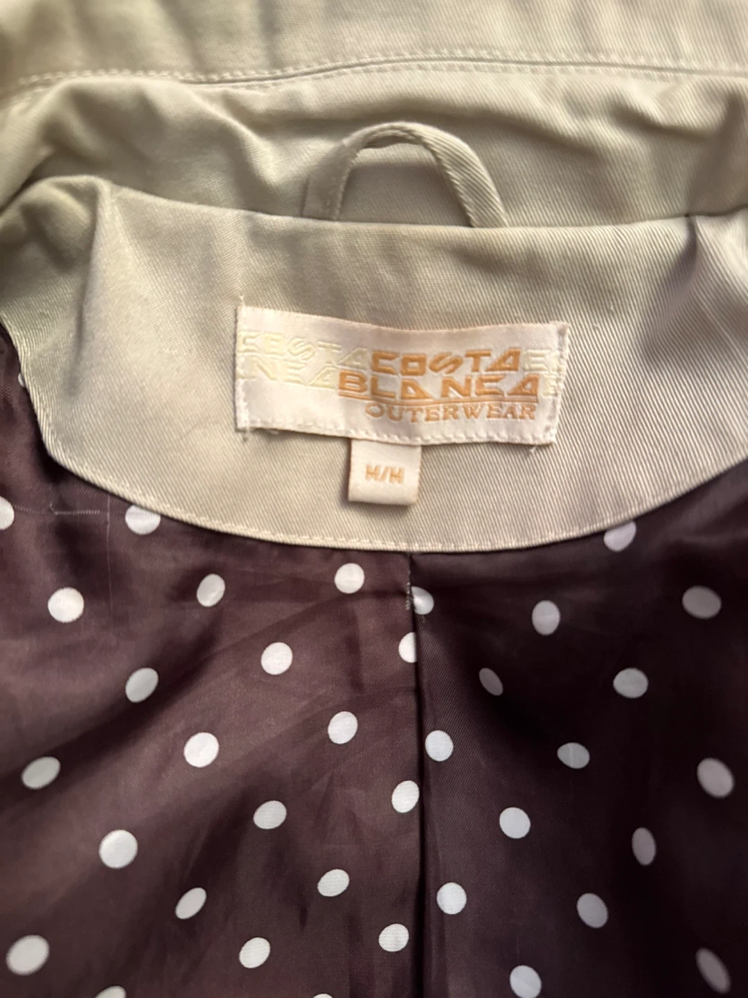Here's a stylish trench coat from Costa Blanca Outerwear! It's a size M and features a unique polka dot lining. Perfect for adding a touch of flair to your wardrobe