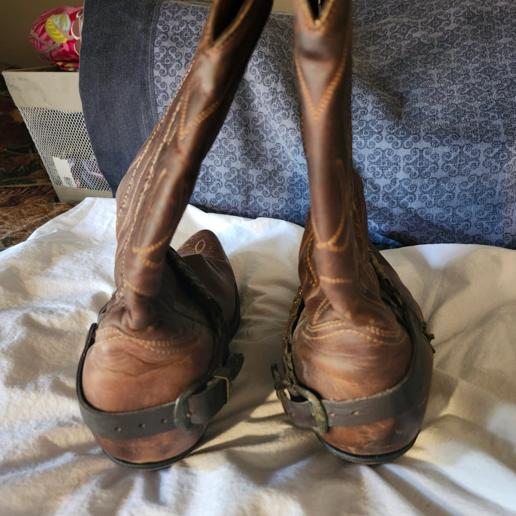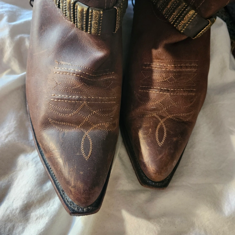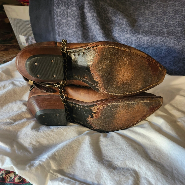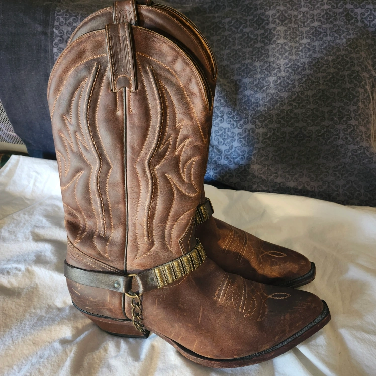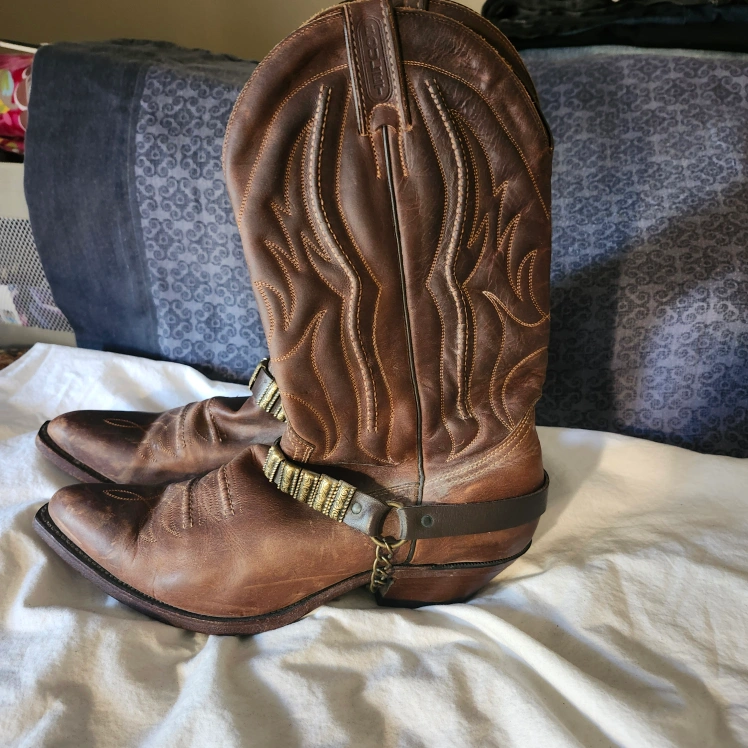 Selling a pair of brown leather cowboy boots. These boots have a decorative stitched design and a unique strap detail. They show some signs of wear on the soles, but are still in good condition for their age and style