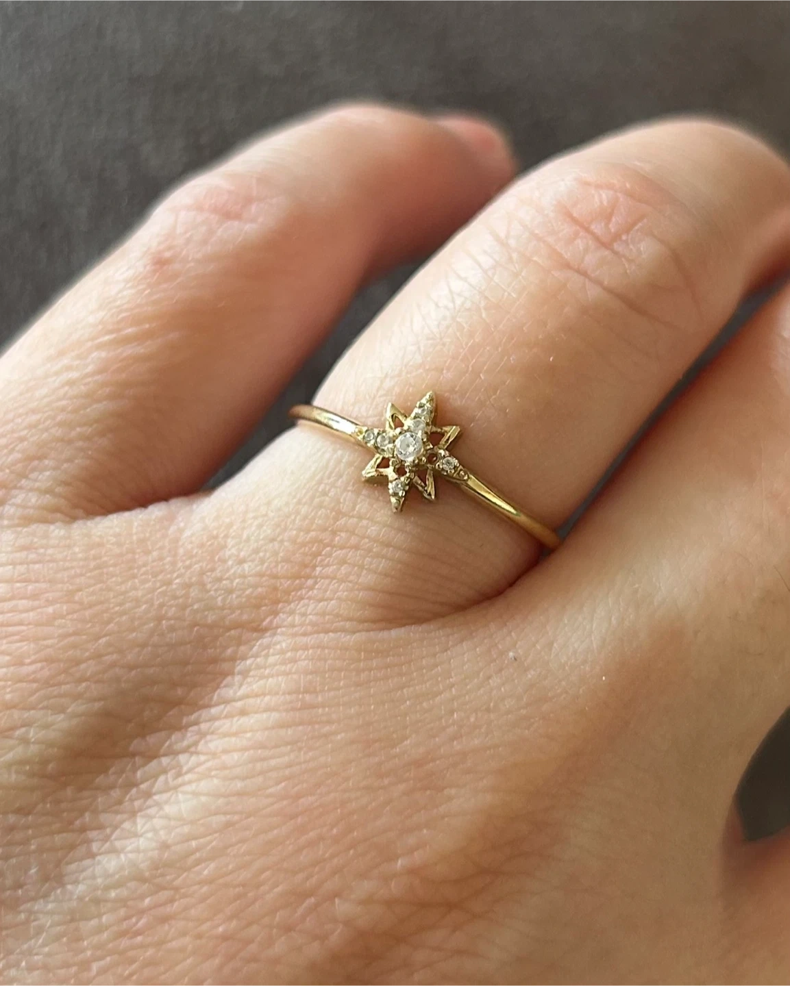 Selling a dainty 14k gold-plated on 925 silver ring featuring a starburst design with small cubic zirconia stones . It's beautiful and great for everyday wear.