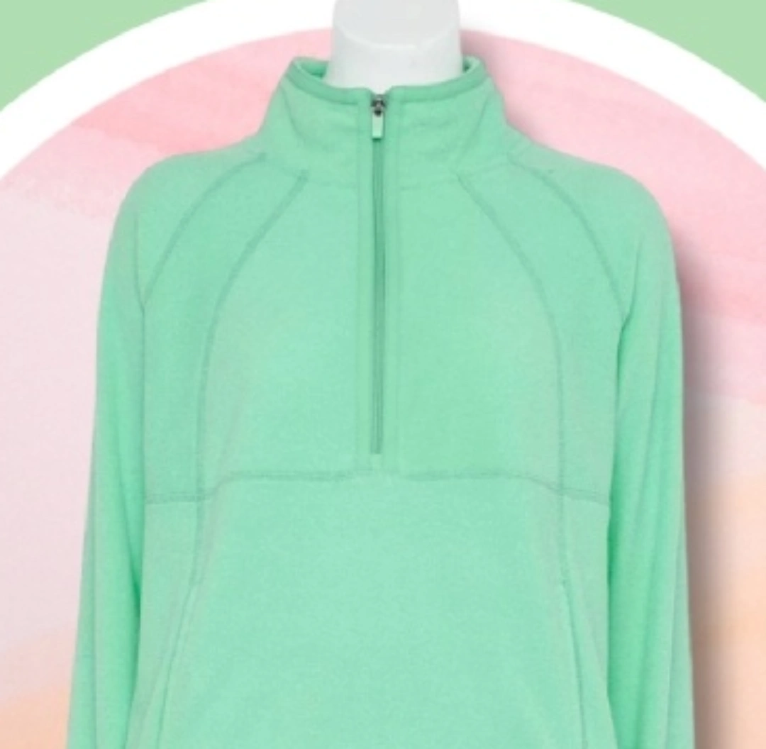 Perfect for Layering on Chilly Days. The color is a nice, soft green. It features a Quarter-zip design & a comfortable fit w Contrasting Piping & a Kangaroo Pocket.