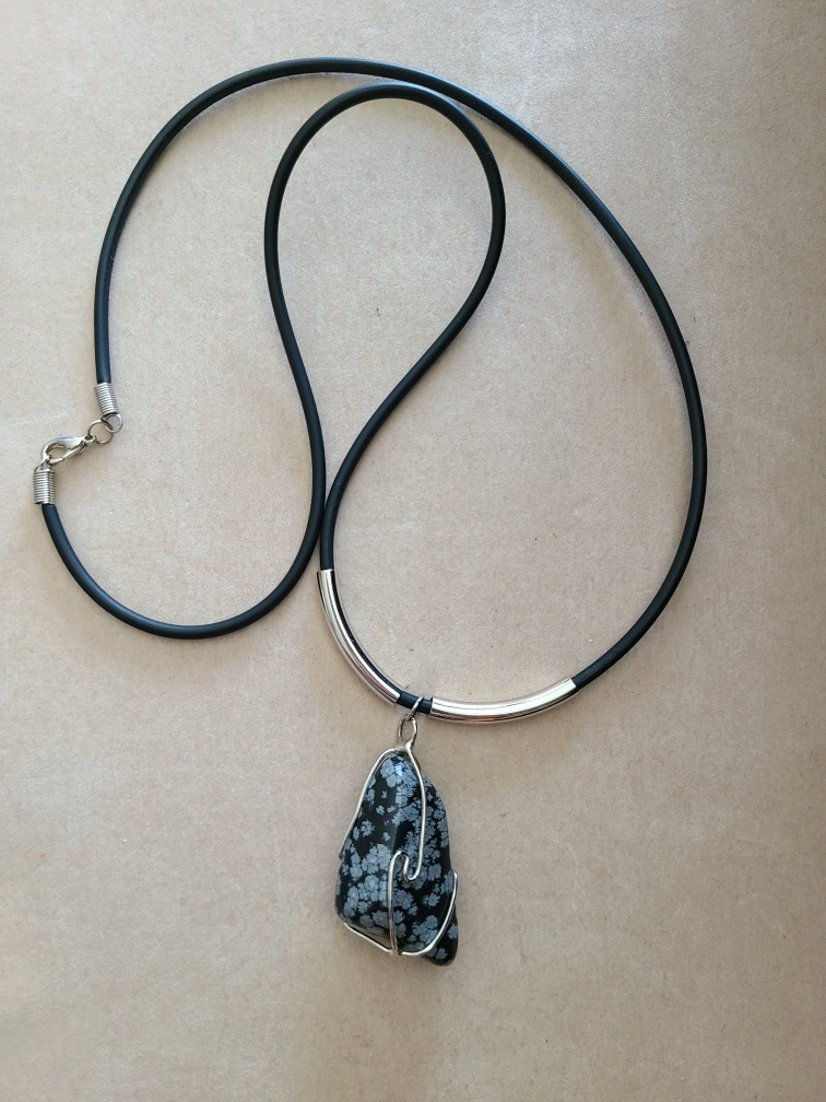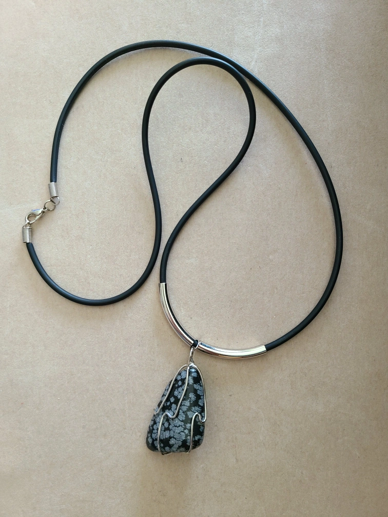 Unique handmade necklace. The rock pendant is wire-wrapped and hangs from a black cord with a silver-tone accent piece. A lovely piece to add to your collection