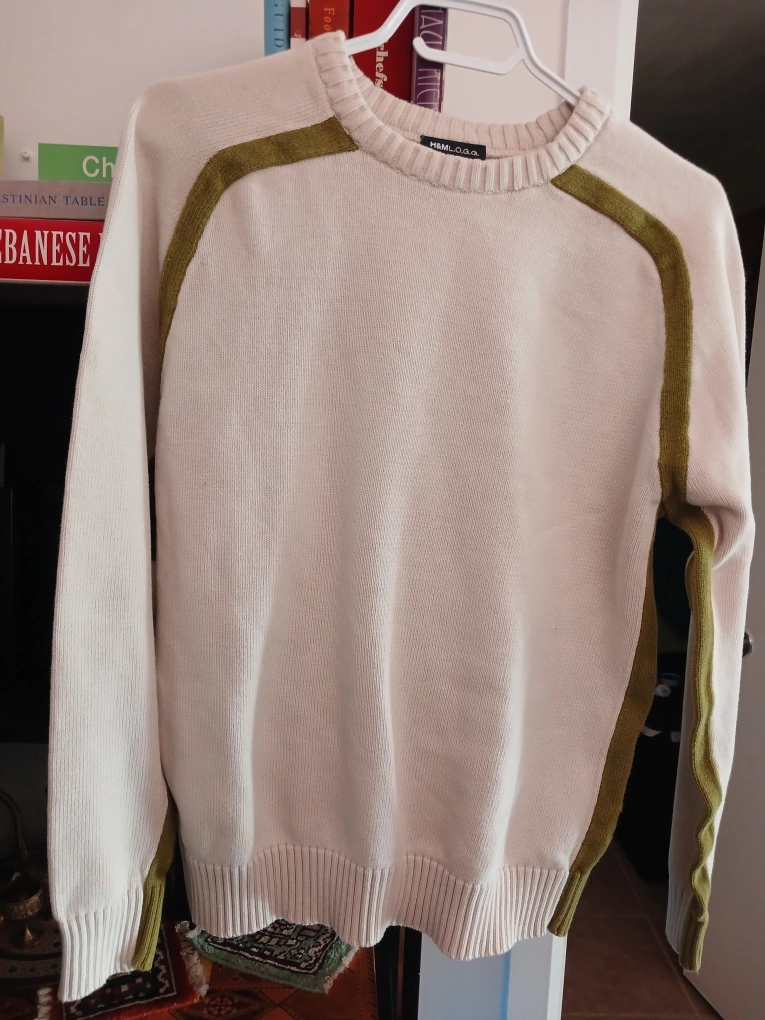 Selling a gently used H&M sweater! It's a cream colour with green detailing on the sleeves and shoulders. It's in great condition and perfect for layering or wearing on its own. A great addition to any wardrobe!
