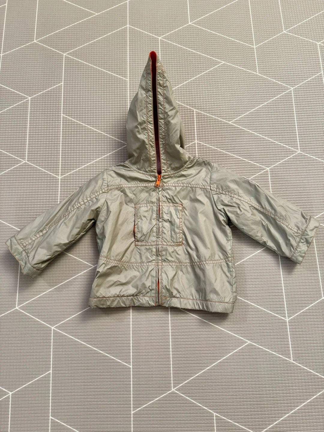 This Gymboree jacket is perfect for your little one! It's sized for 18-24 months. The outer material is a light grey colour and the inside is lined with a soft, bright orange fleece. Great for keeping your kiddo warm and cozy on cooler days