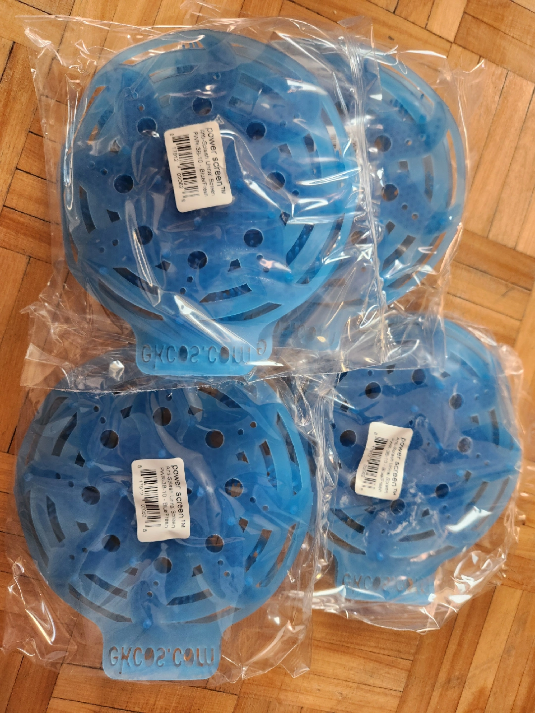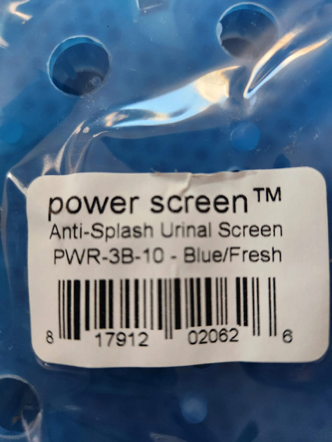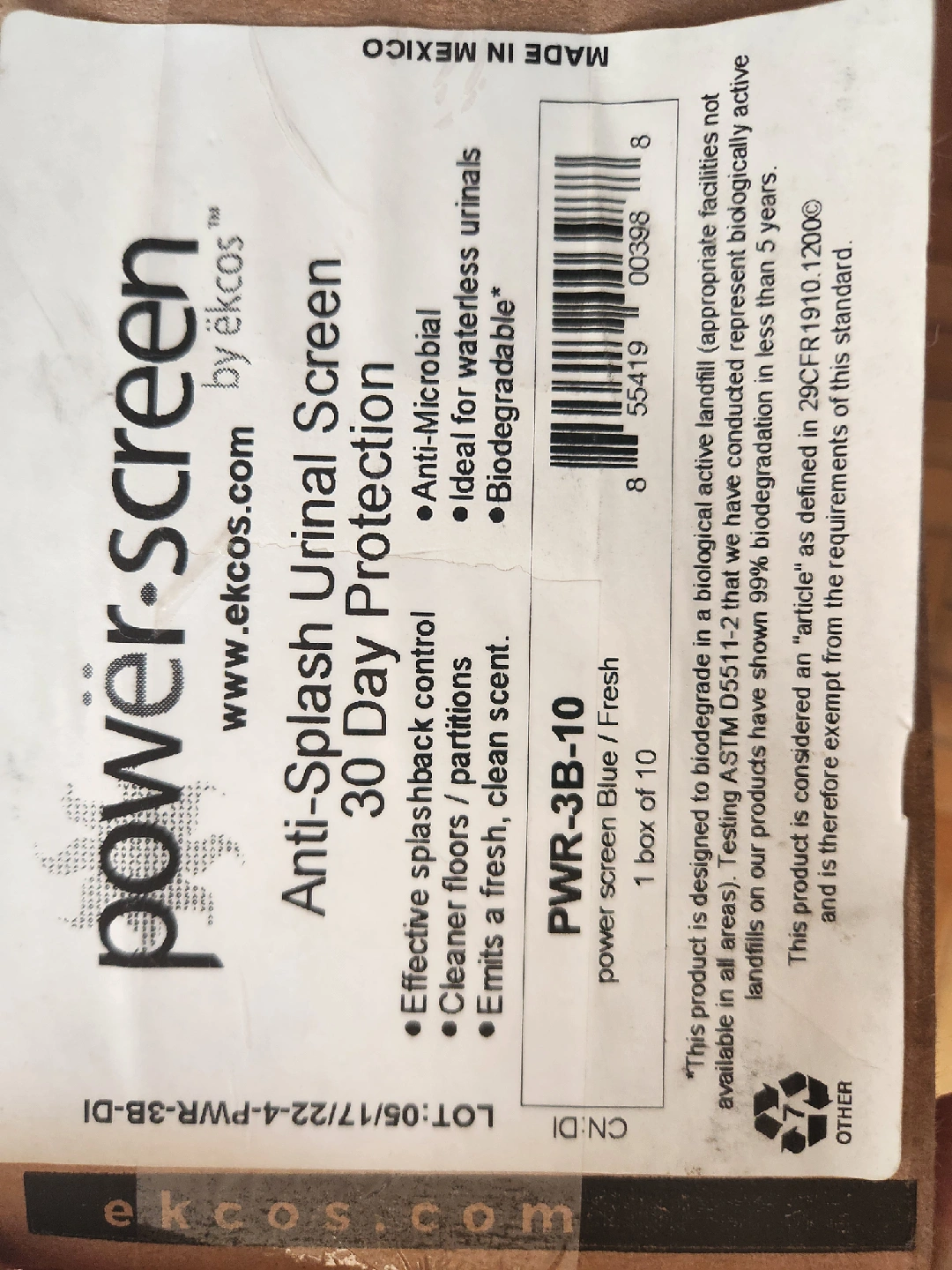 Set of new Ekcos Power Screen anti-splash urinal screens! Made in North America. These are blue and fresh scented, model PWR-3B-10. They offer 30 days of protection and are anti-microbial and biodegradable. The best choice for offices and cleaning companies. Box includes 8 units.