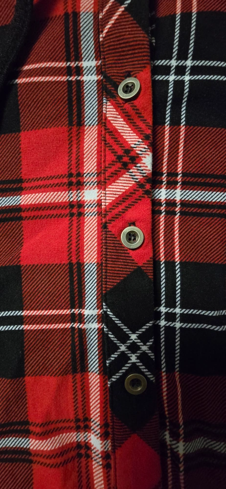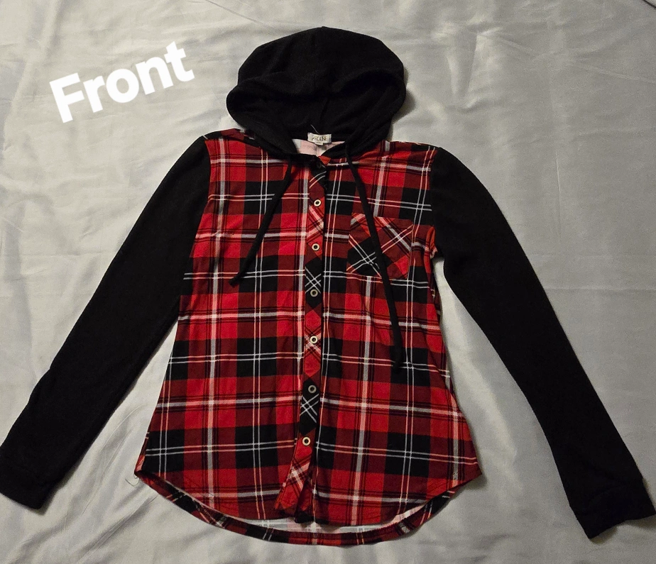 Here's a cute hooded shirt from Ardene! It features a red and black plaid pattern on the body and solid black sleeves and hood. The shirt has a button-up front and a small pocket on the chest!