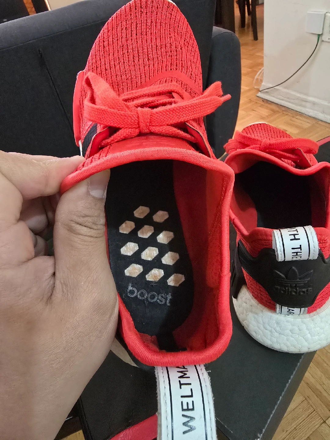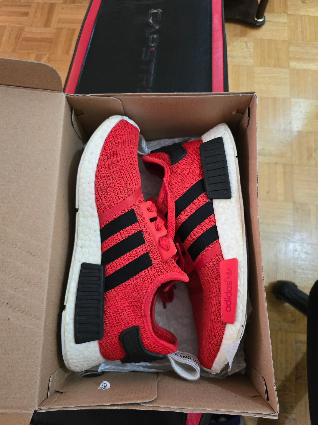 Selling a pair of Adidas NMD_R1 sneakers in a vibrant red and black colourway. These are a men's US size 9, UK size 8.5, and EUR size 42 2/3. used couple of times in good condition. They come with the original box!