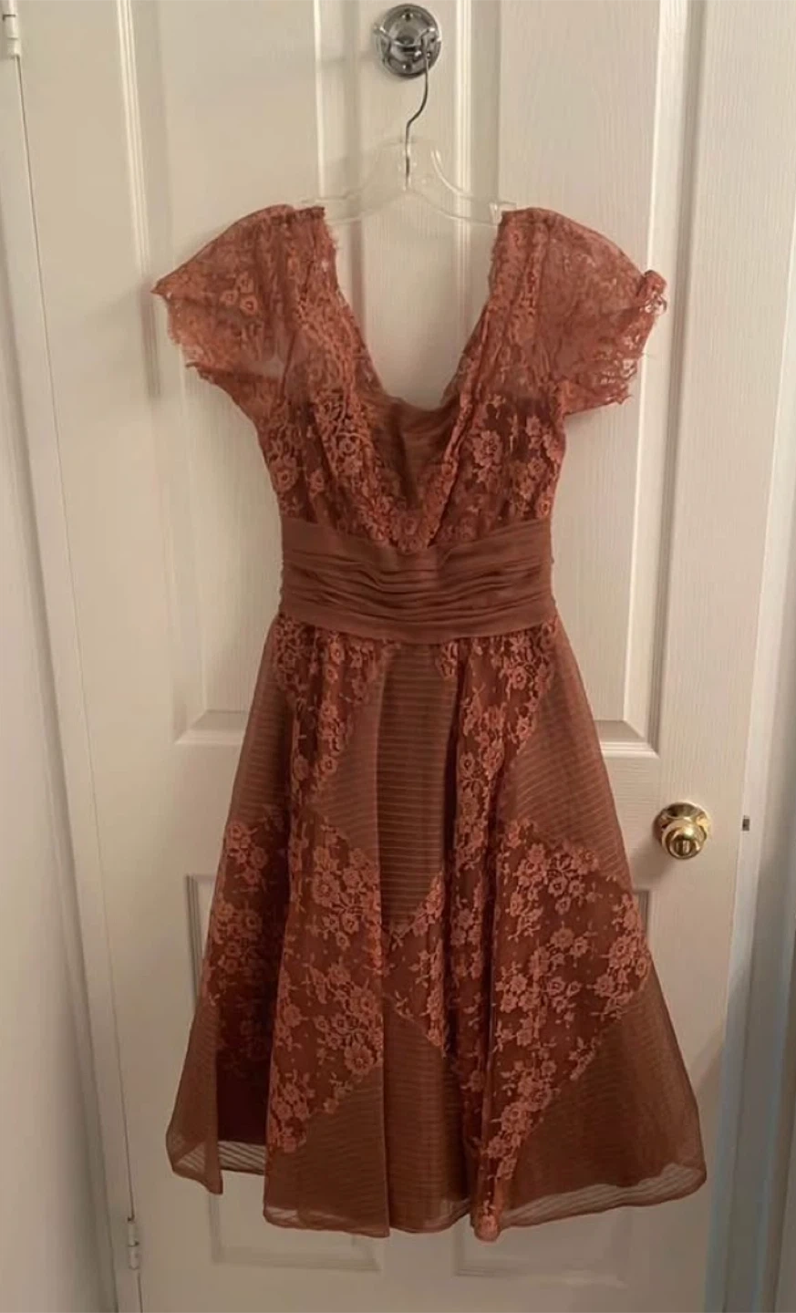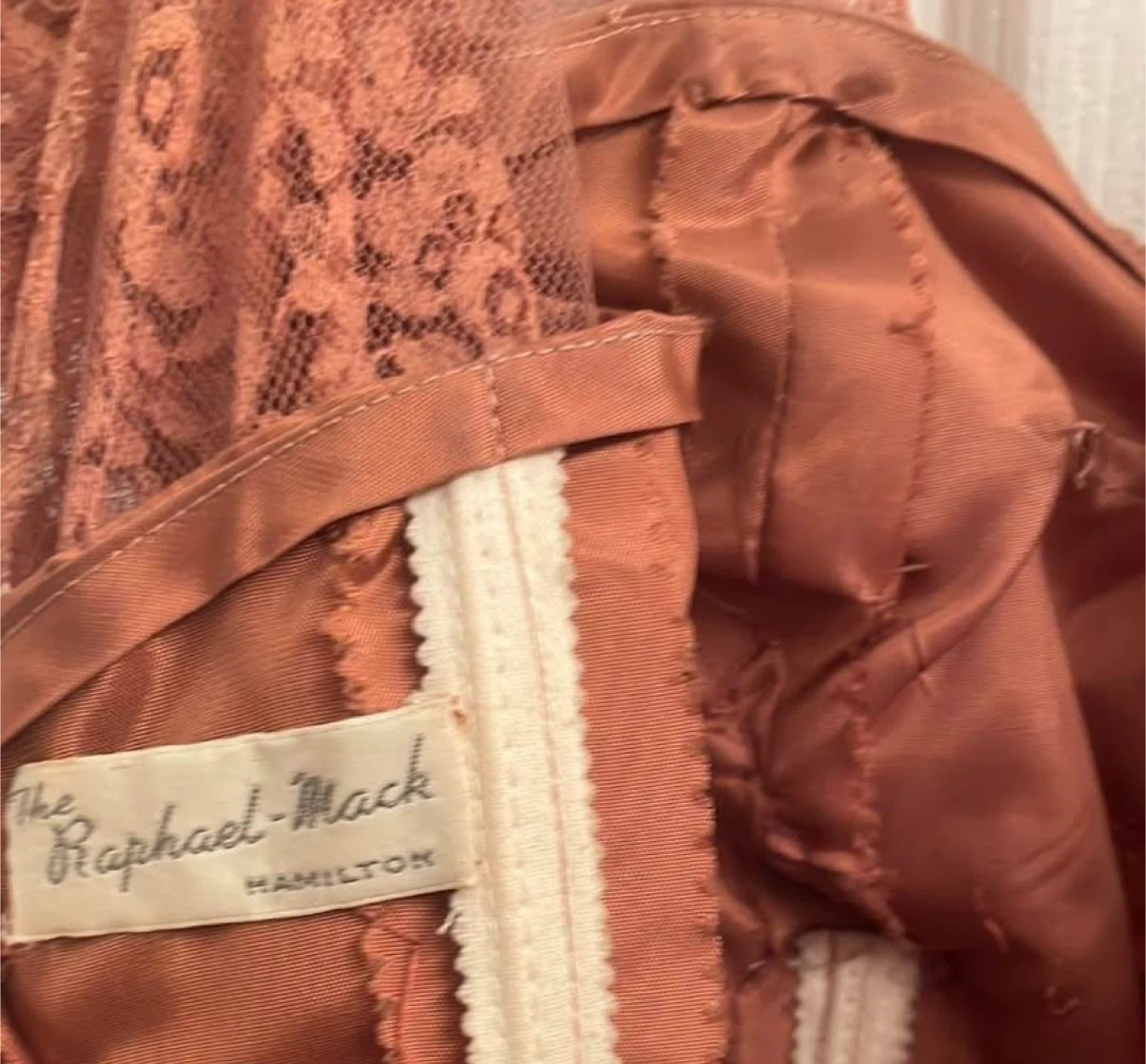 535Beautiful lace dress from Raphael-Mack in a lovely bronze colour. Raphael Mack was a Hamilton-based store that first opened in 1903, own a piece of Candiana with this gorgeous gown. This stunning Raphael Mack dress (Approximate size 2 US) in a warm bronze hue is perfect for a wedding guest or cocktail event. It features a flattering fit and flare silhouette with a plunging V-neckline and delicate flutter cap sleeves, with built in boning from the early 1960s. The dress is designed to accentuate the waist and flows beautifully to a midi length, offering both elegance and comfort. Note, giving away cause I want her to be saved from the landfill. And due to damage to lace on back of shoulders, which could be fixed or repurposed.