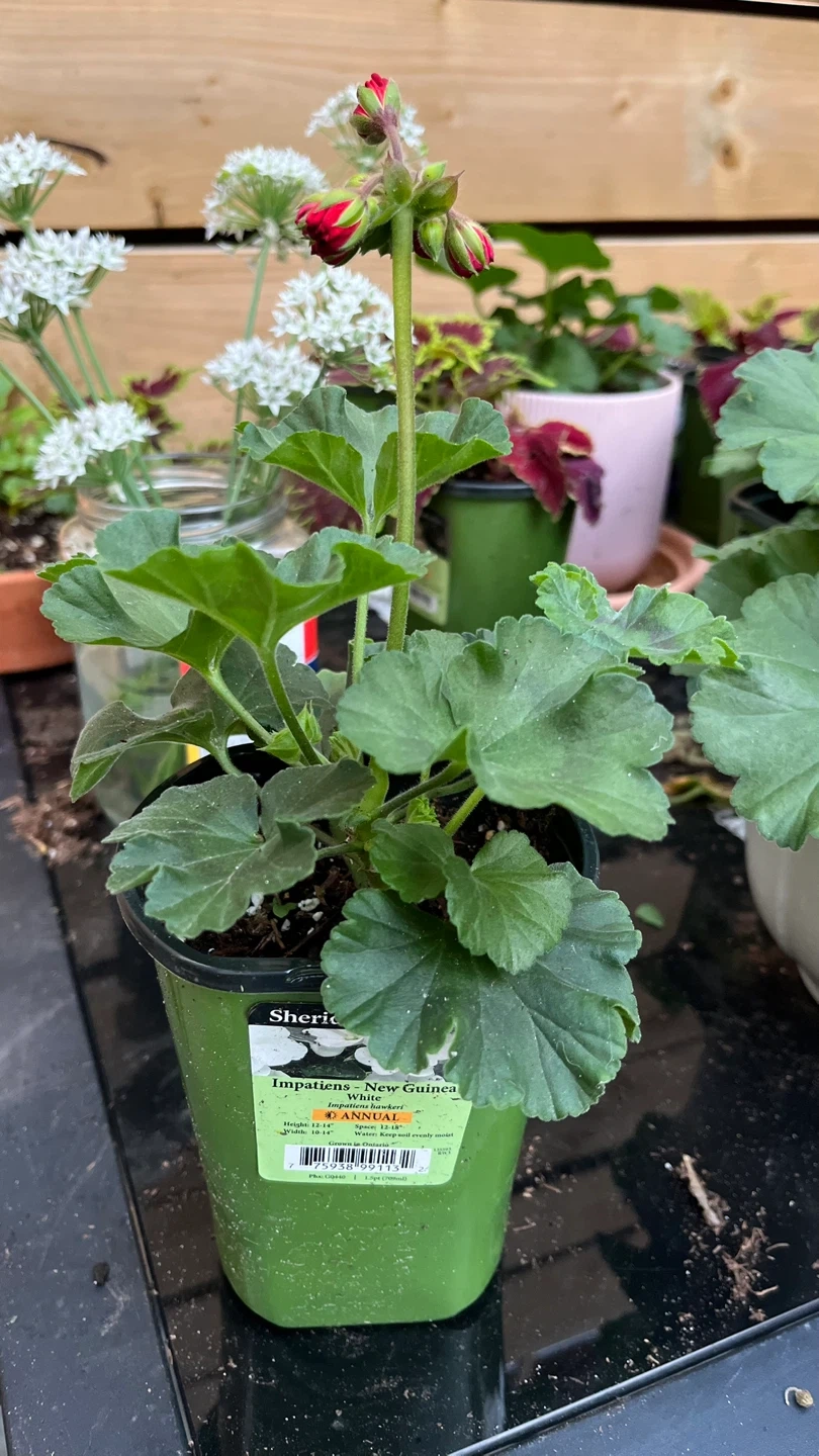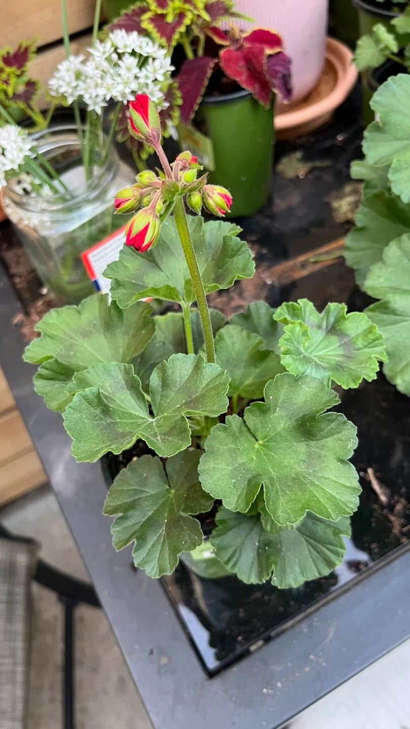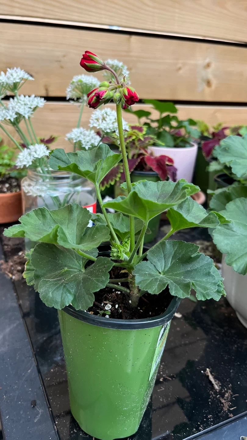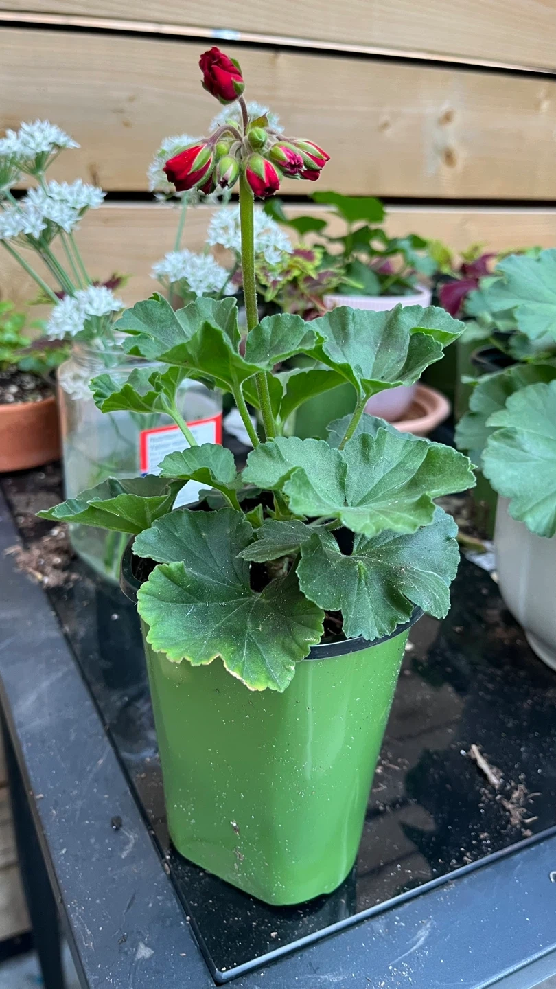 I'm selling a beautiful red geranium! It's in a lovely green pot and ready to brighten up your space. This plant is known for its vibrant flowers and lush foliage, making it a great addition to any garden or indoor setting
