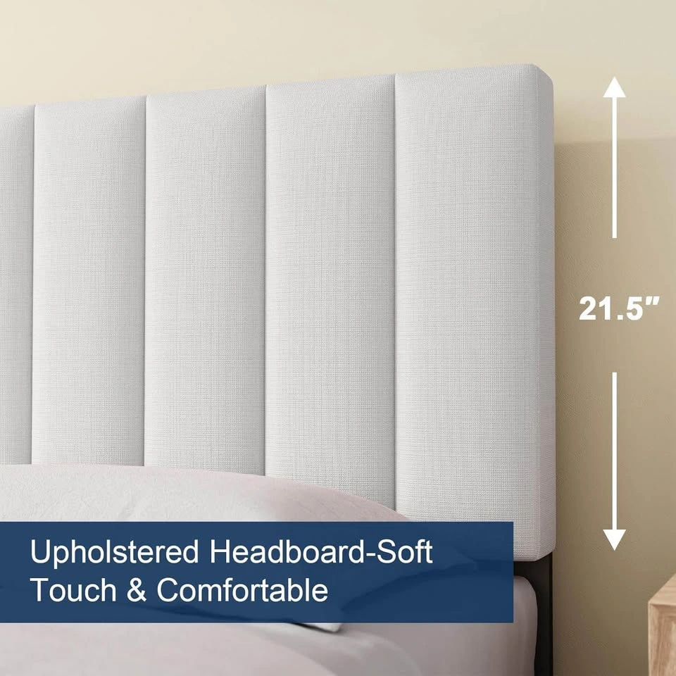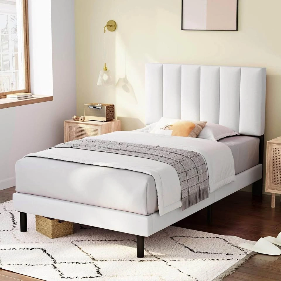 Twin/Single white upholstered platform bed with strong platform. Wooden slats support with metal center bar with legs. Easy and quick assembly design and no need of box spring