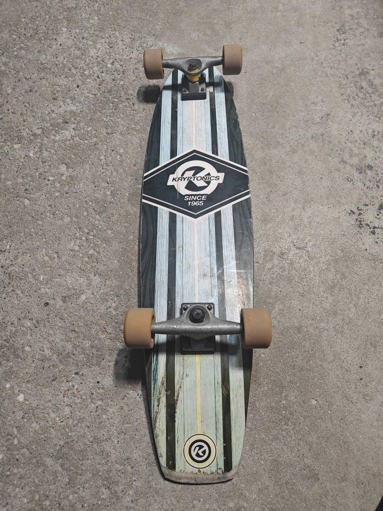 Selling a cool Kryptonics cruiser skateboard! It has a retro vibe with its striped design and the classic Kryptonics logo. Perfect for cruising around town or hitting the boardwalk. It's in good condition and ready to ride! $20 o.b.o.