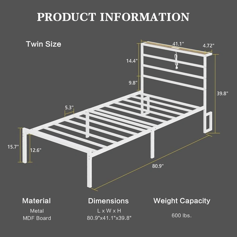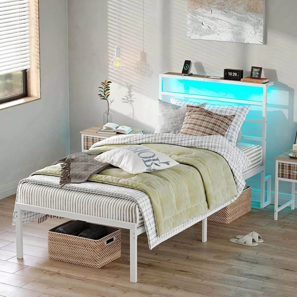 Twin/Single metal platform bed with headboard and footboard. Headboard features LED light and storage shelf.