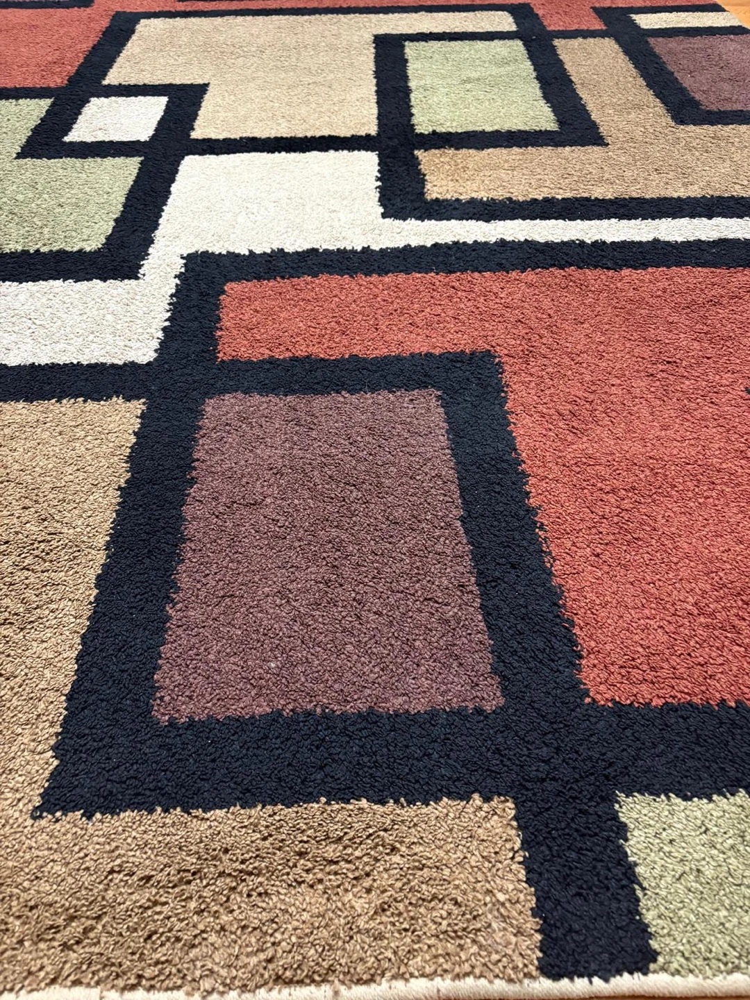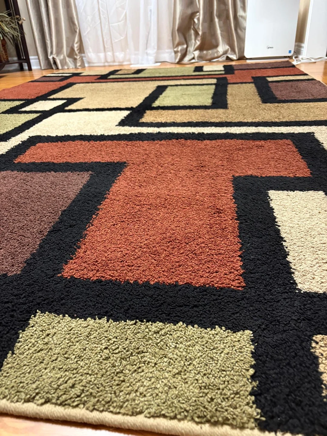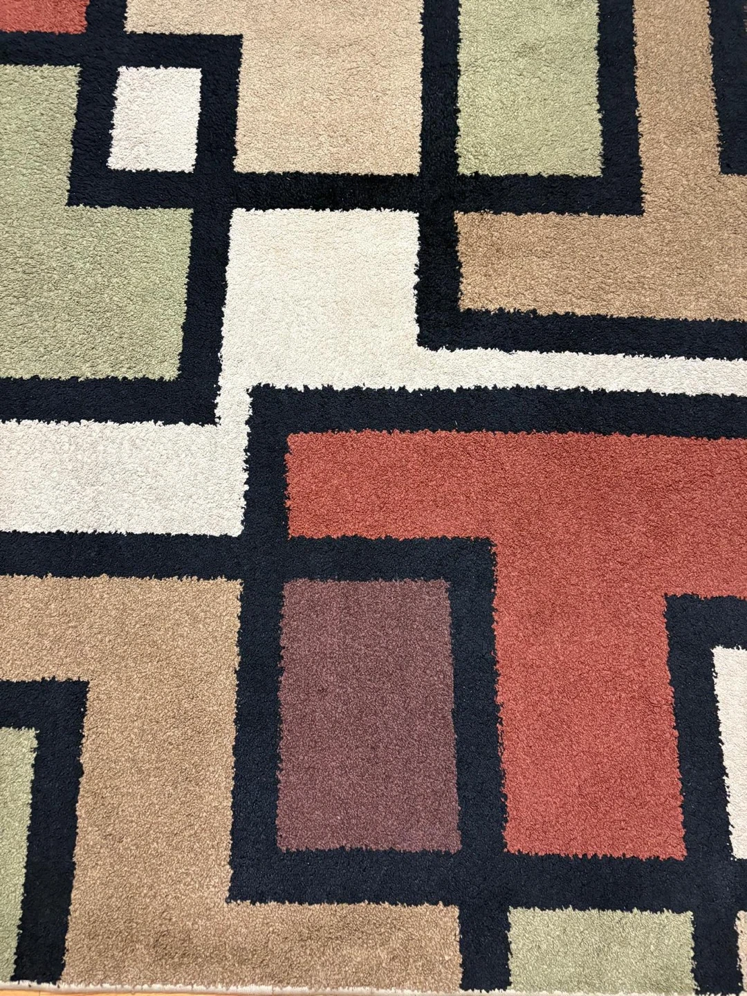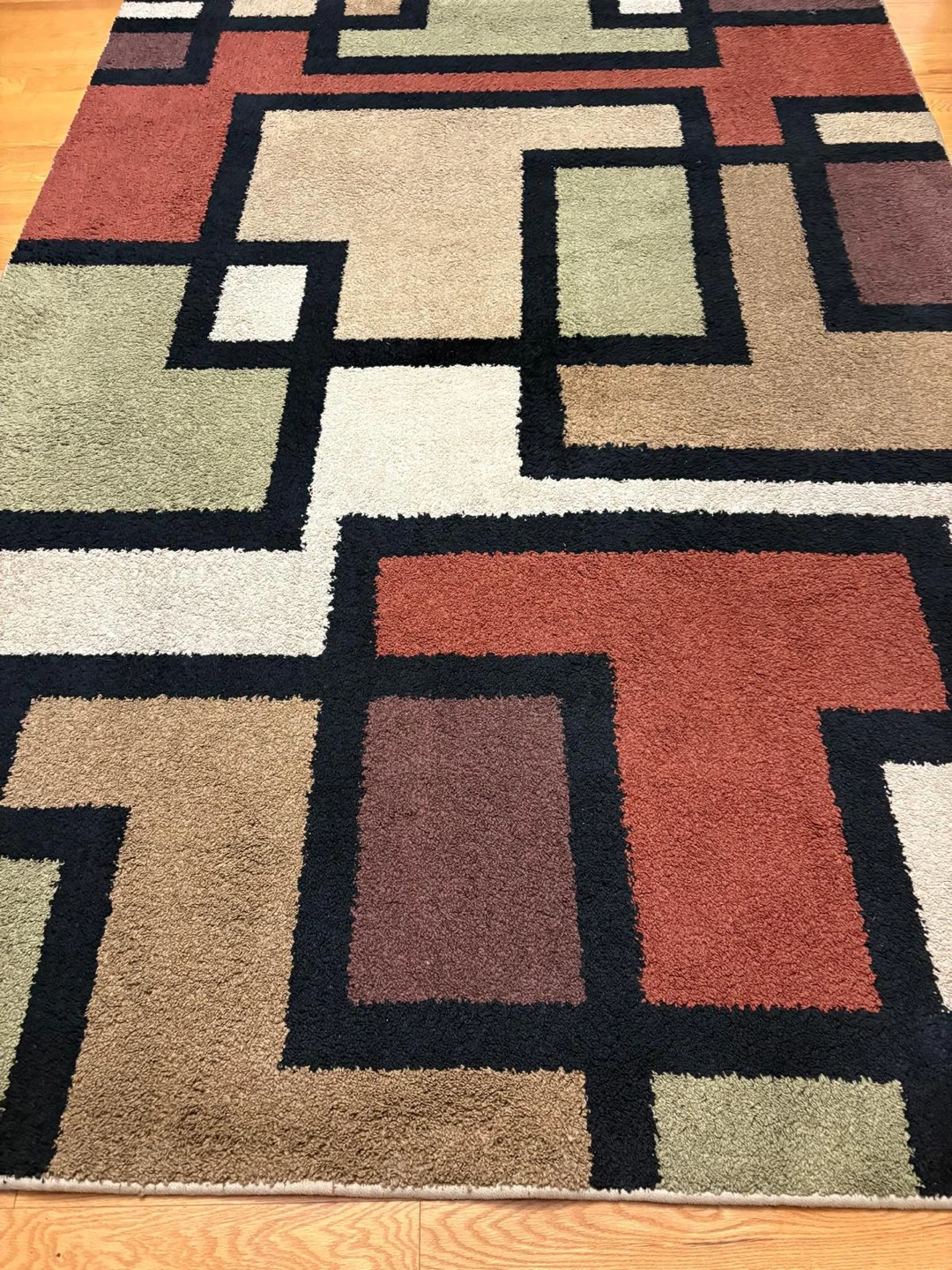 Moving Sale ๐ Area rug with a geometric pattern. The rug features squares and rectangles in various shades of brown, beige, green, and white, outlined with black lines. Perfect for adding a touch of modern style to any room! Measurements: 115 inches x 78 inches