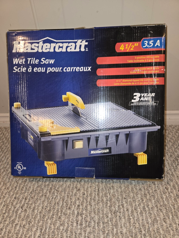 Selling a Mastercraft wet tile saw. It has a 4 1/2" diamond-tipped tile cutting blade. It also features a 3-position tilting table and adjustable work fence. Perfect for your next tiling project! Used only once!