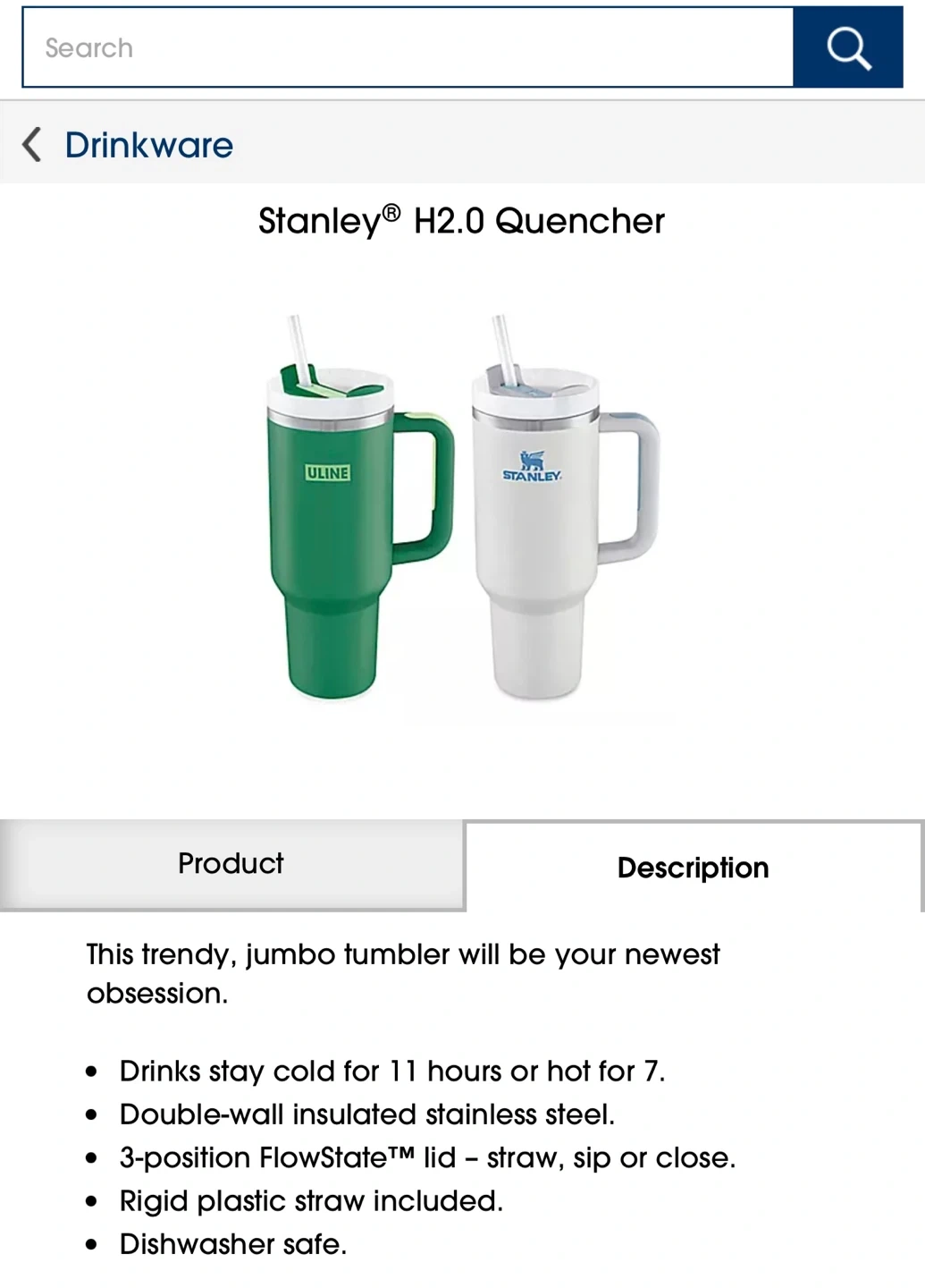 Stanley H2.0 Quencher in the 40 oz size! This trendy, jumbo tumbler will definitely be your new obsession. Keeps drinks cold for 11 hours or hot for 7. It features a double-wall insulated stainless steel and a 3-position FlowState lid, so you can sip, straw, or close. Plus, it's dishwasher safe for easy cleaning