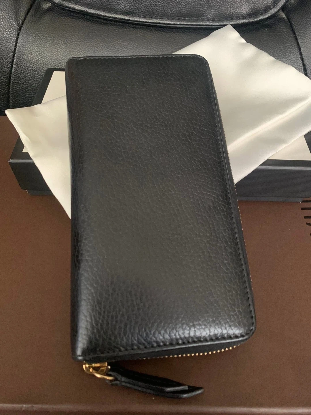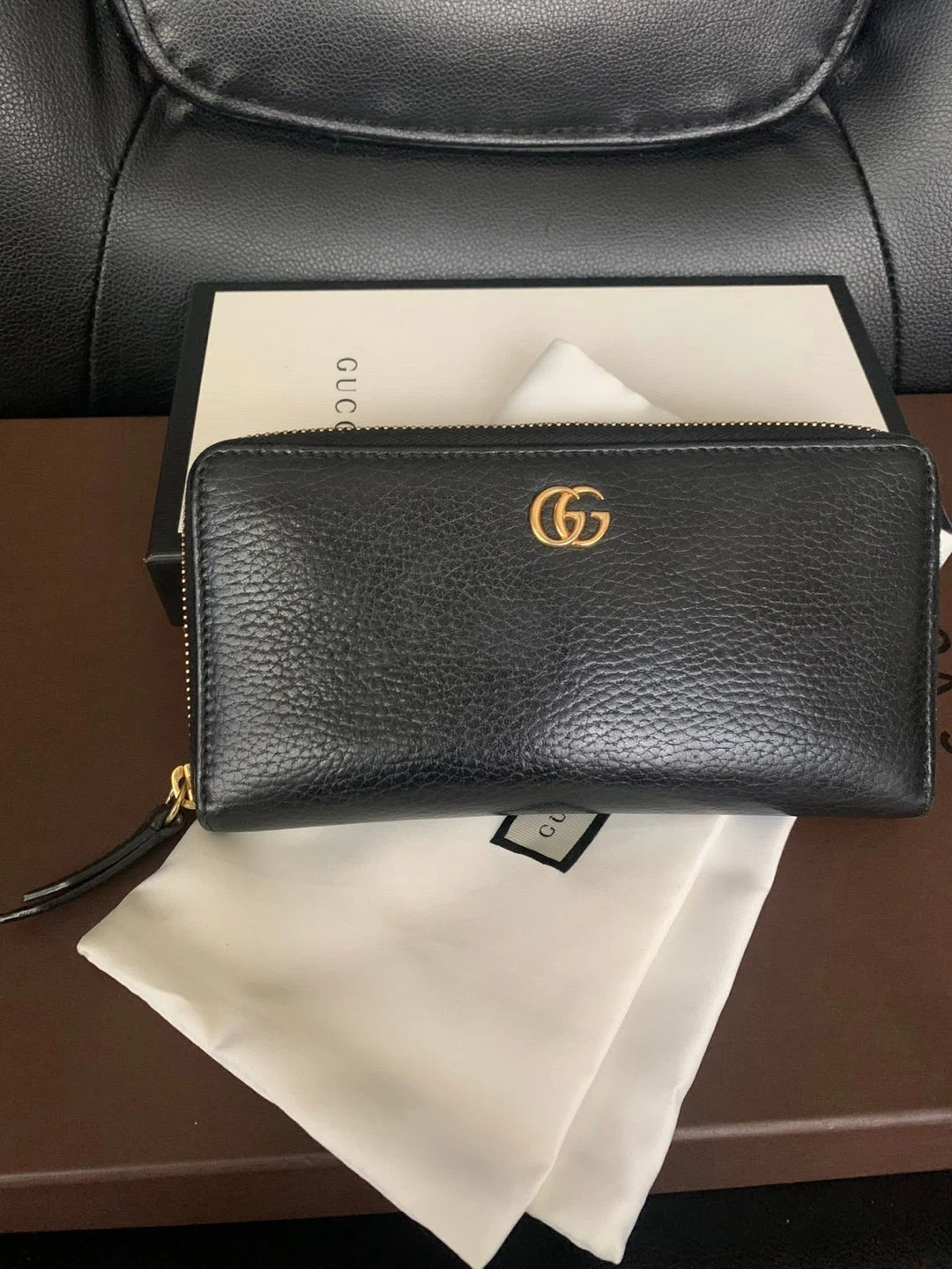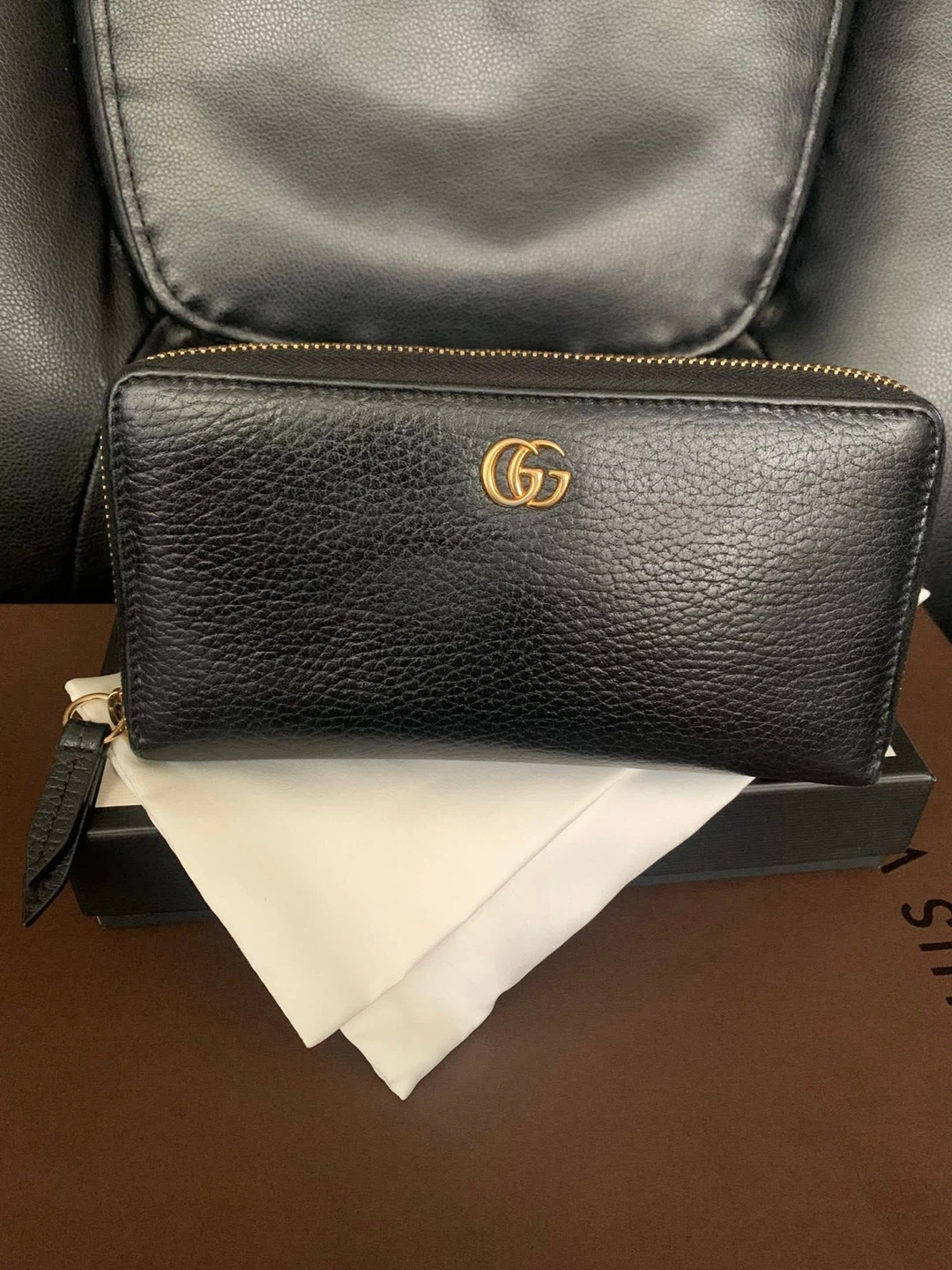 Selling a Gucci black leather zip around wallet in great condition! It comes with the original box and dust bag. The wallet features the iconic GG logo in gold-tone hardware. Perfect for keeping your cards and cash organized!