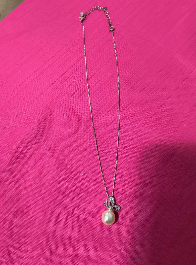 A lovely pearl pendant necklace! The pendant features a faux pearl with a butterfly design encrusted with small rhinestones. It's a delicate and elegant piece that would make a great addition to any jewelry collection
