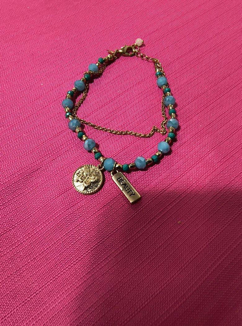 Cute beaded bracelet with a gold-tone charm that says 'Beauty'! The beads are a mix of turquoise and green. It's in great condition and would be a lovely addition to any outfit