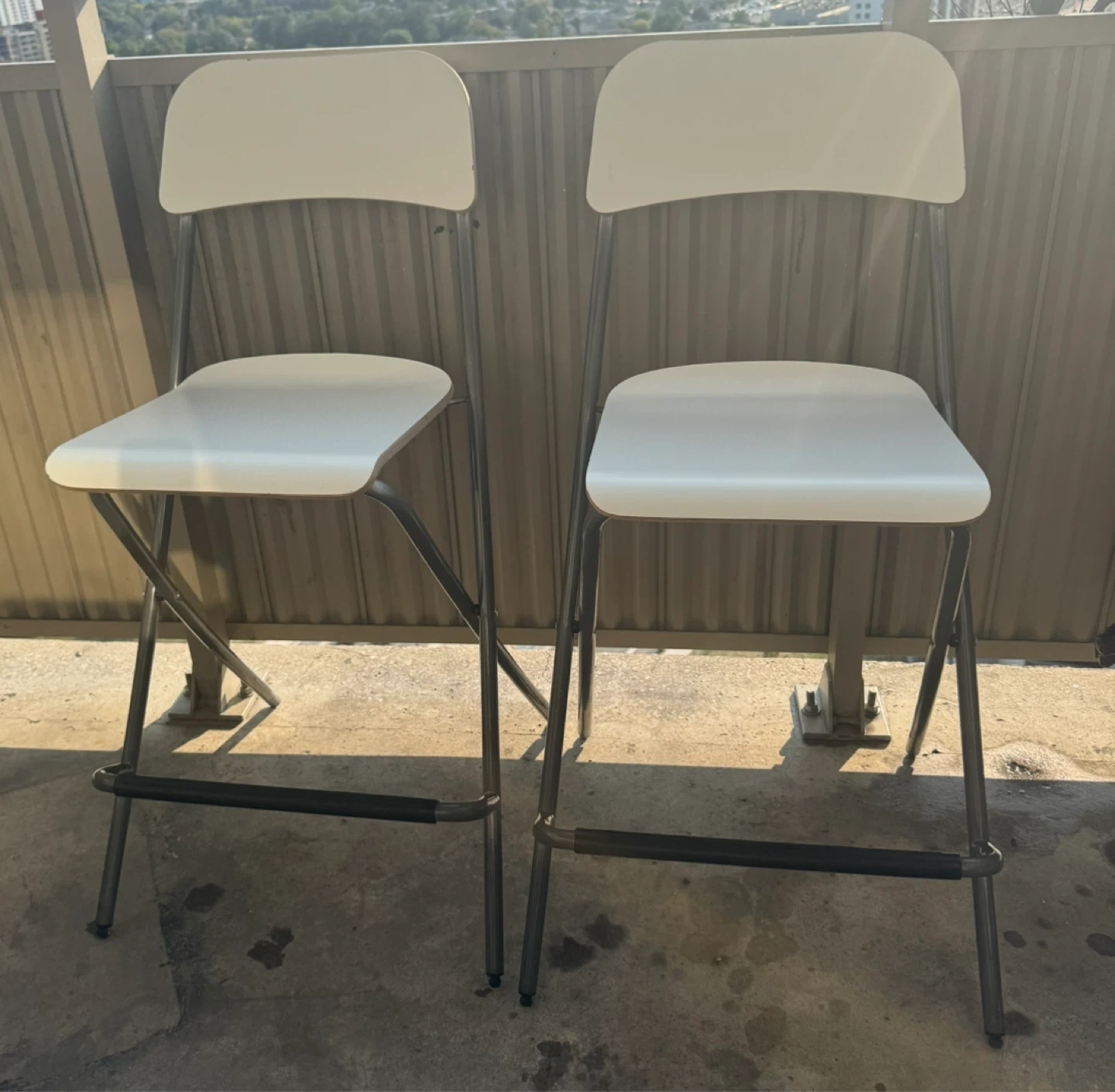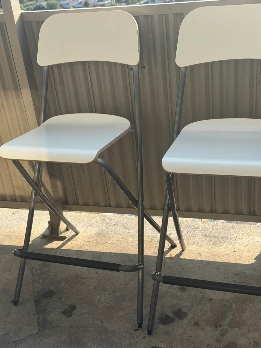 Selling two IKEA Franklin folding counter-height bar stools in great condition! They're white with metal frames and footrests. Perfect for adding extra seating in your kitchen or at a high table. Easy to fold up and store when not in use. Tested for up to 220 lbs.