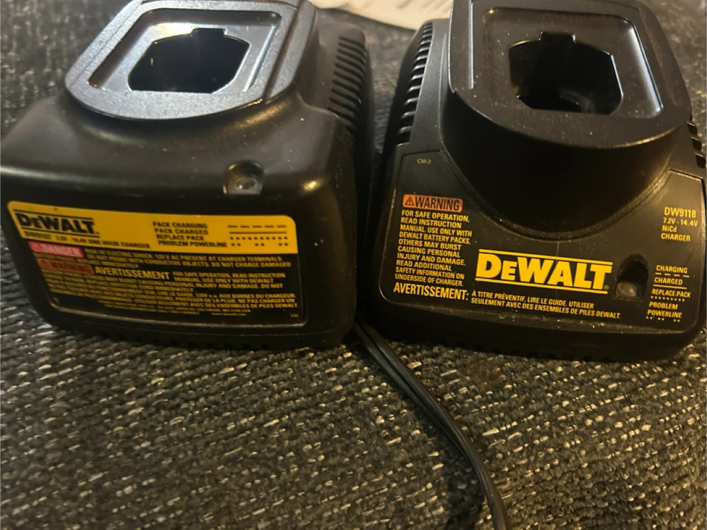 Selling two DeWalt battery chargers. One is model DW9118 (7.2V-14.4V NiCd charger) and the other is DW9106 (7.2V - 14.4V One Hour Charger). Both are in good working condition and ready to keep your DeWalt batteries charged up!