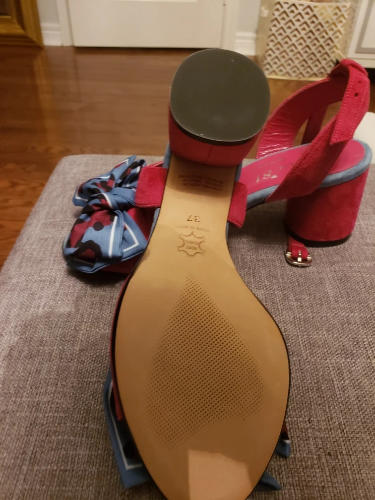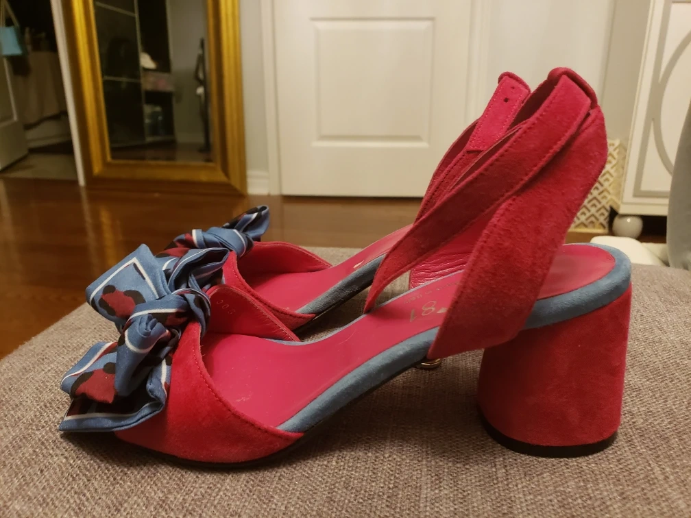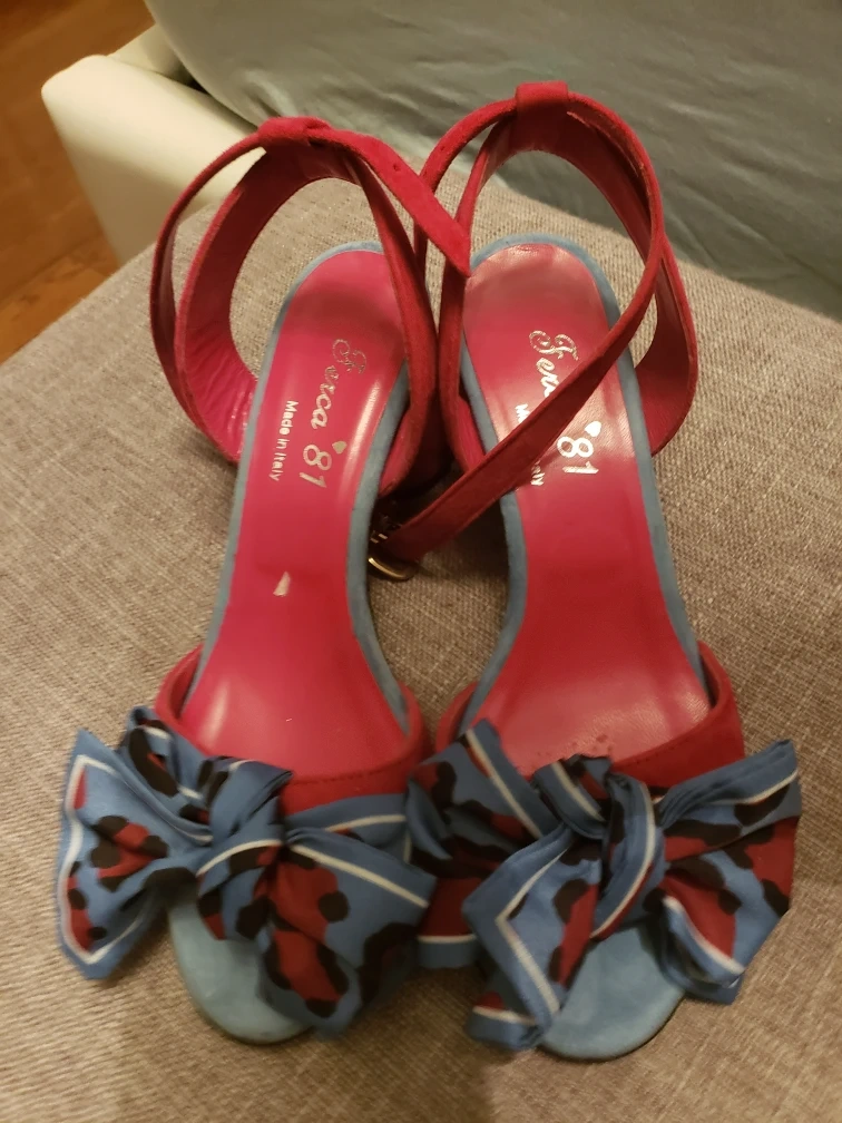 These are a pair of Ferca 81 sandals in size 37. They feature a vibrant red suede material with a cute bow detail. Made in Italy, these stylish sandals are sure to add a pop of colour to your outfit!