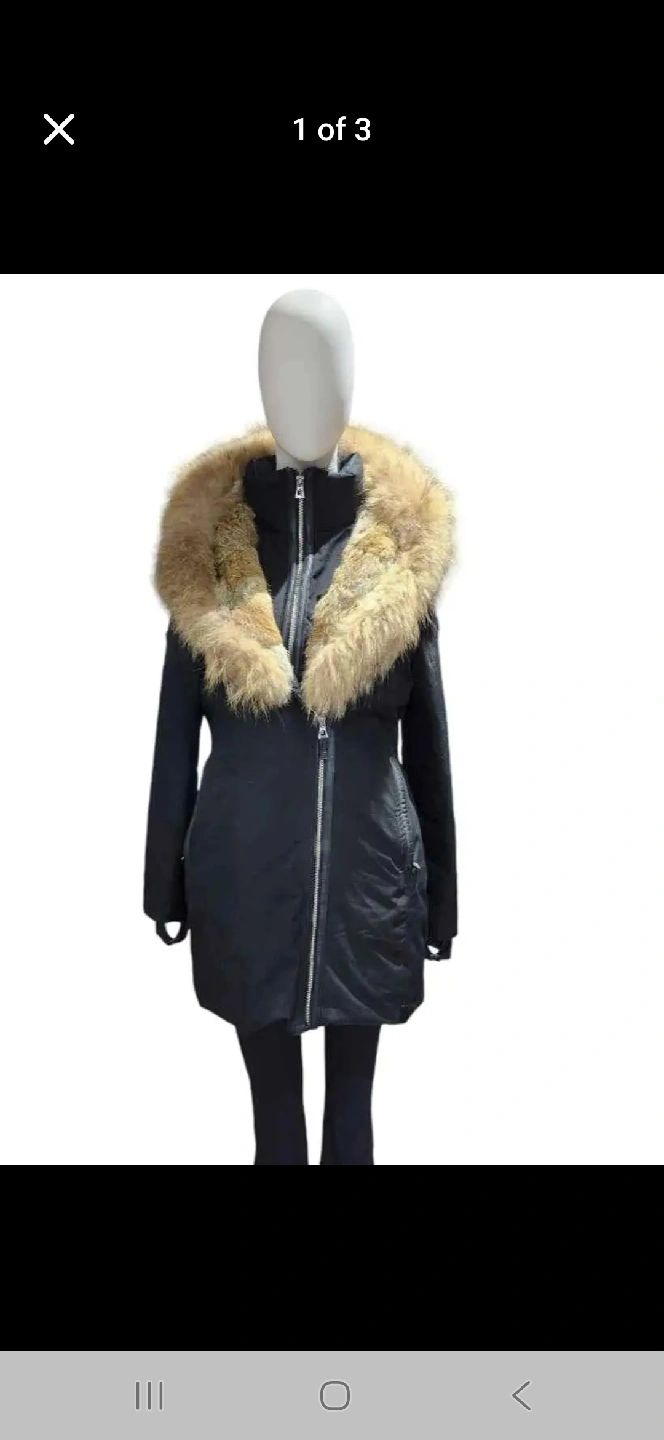 black down winter coat with a fur-trimmed hood. It's in great condition and ready to keep you warm this winter!